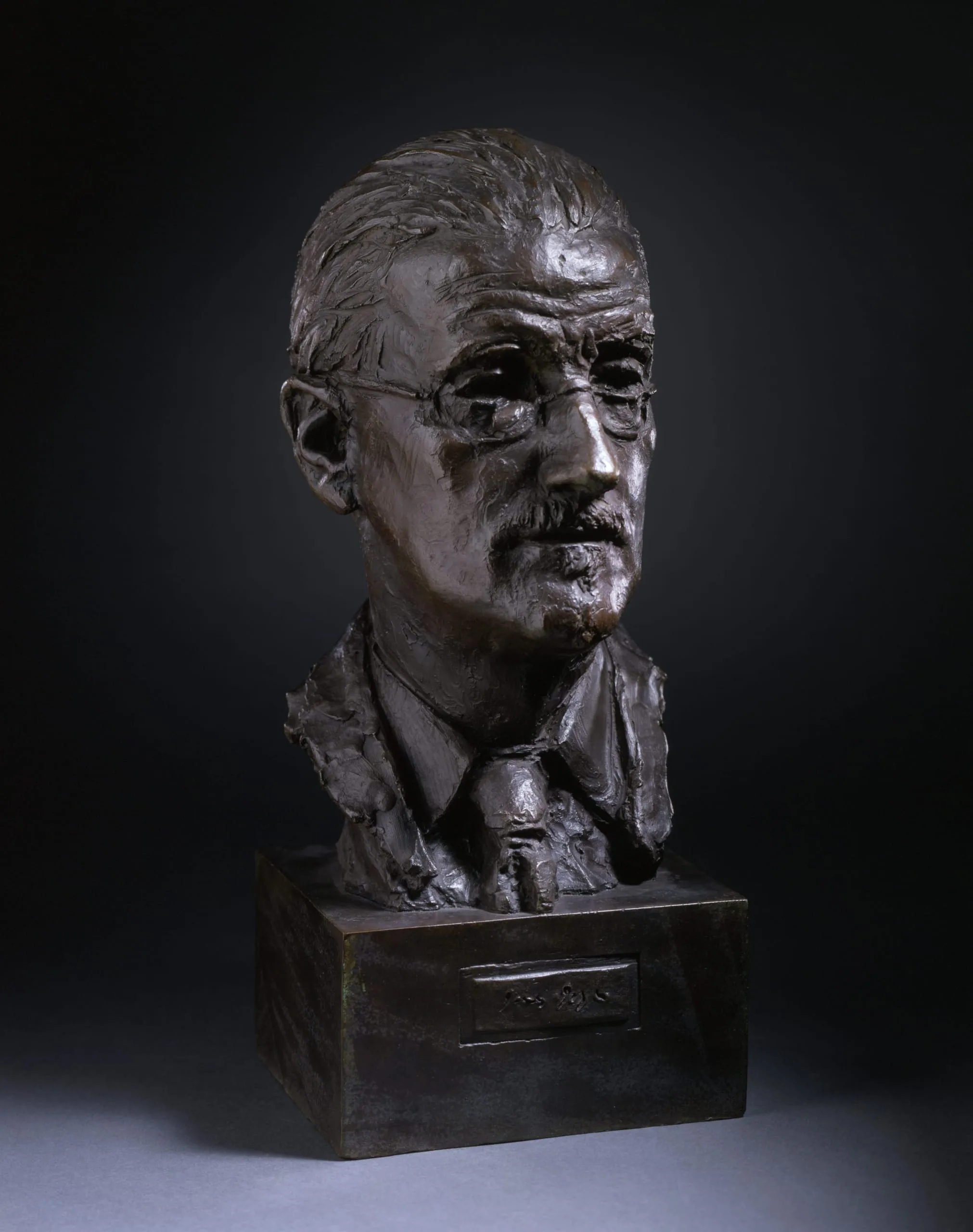Davidson first met Joyce in 1919 and had long wanted to sculpt him, for he found the author "frail, detached and the essence of sensitivity." Davidson aptly captured the intellectual aspect of Joyce, and when the bust was exhibited in 1933 a critic wrote that it "bespeaks the restraint of the ascetic mingled with perplexity common to the brow of the philosopher." Although Davidson had difficulty rendering Joyce’s eyeglasses, he successfully indicated them with delicately incised lines and ridges. Joyce often shaved off his goatee, so Davidson made two versions of his head, one with and one without it.