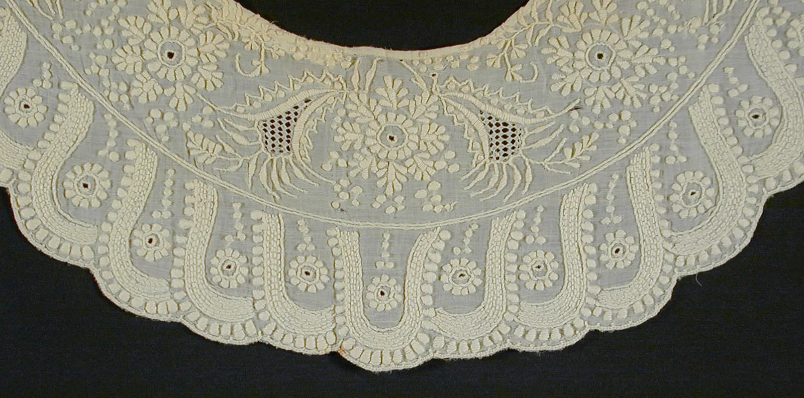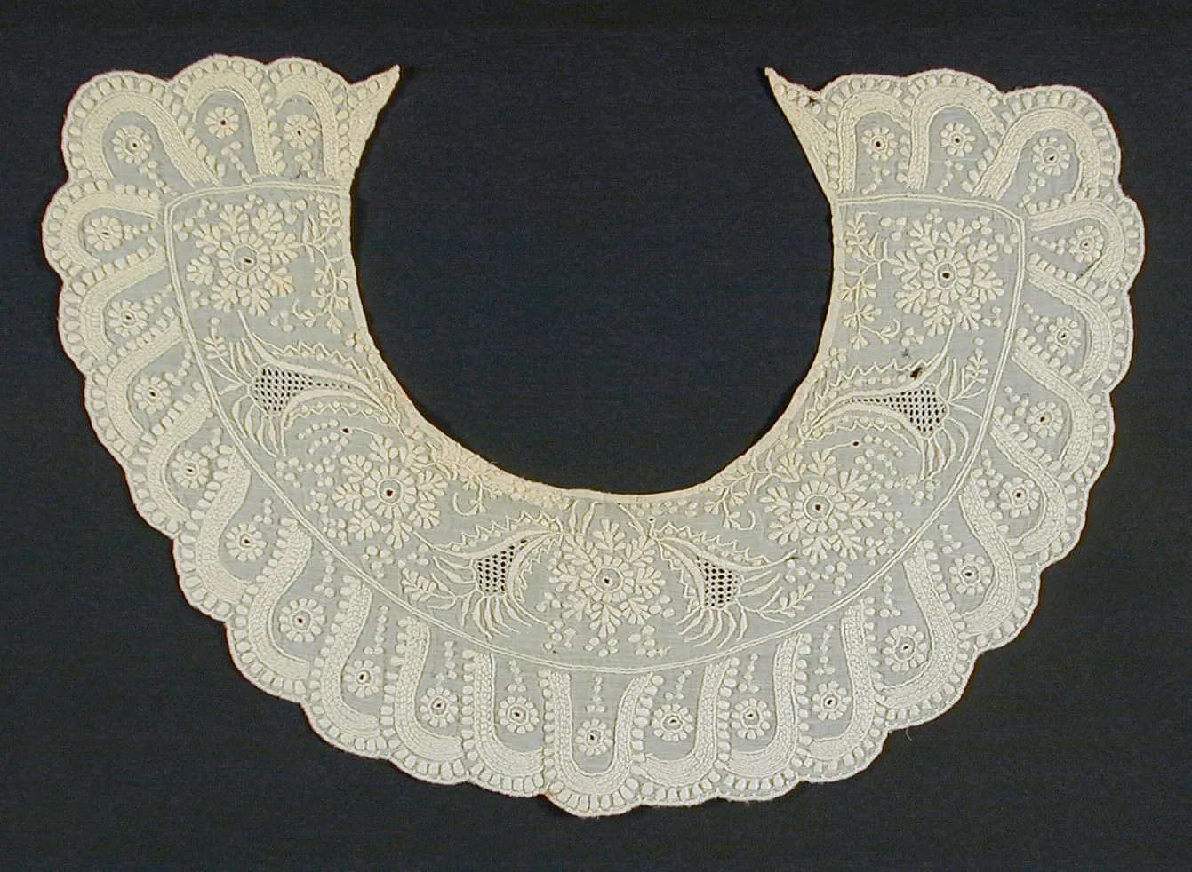Embroidered white muslin collar with scalloped edge, featuring dense whitework floral motifs, scrolling botanical sprays, and small openwork cutwork sections along the upper border.