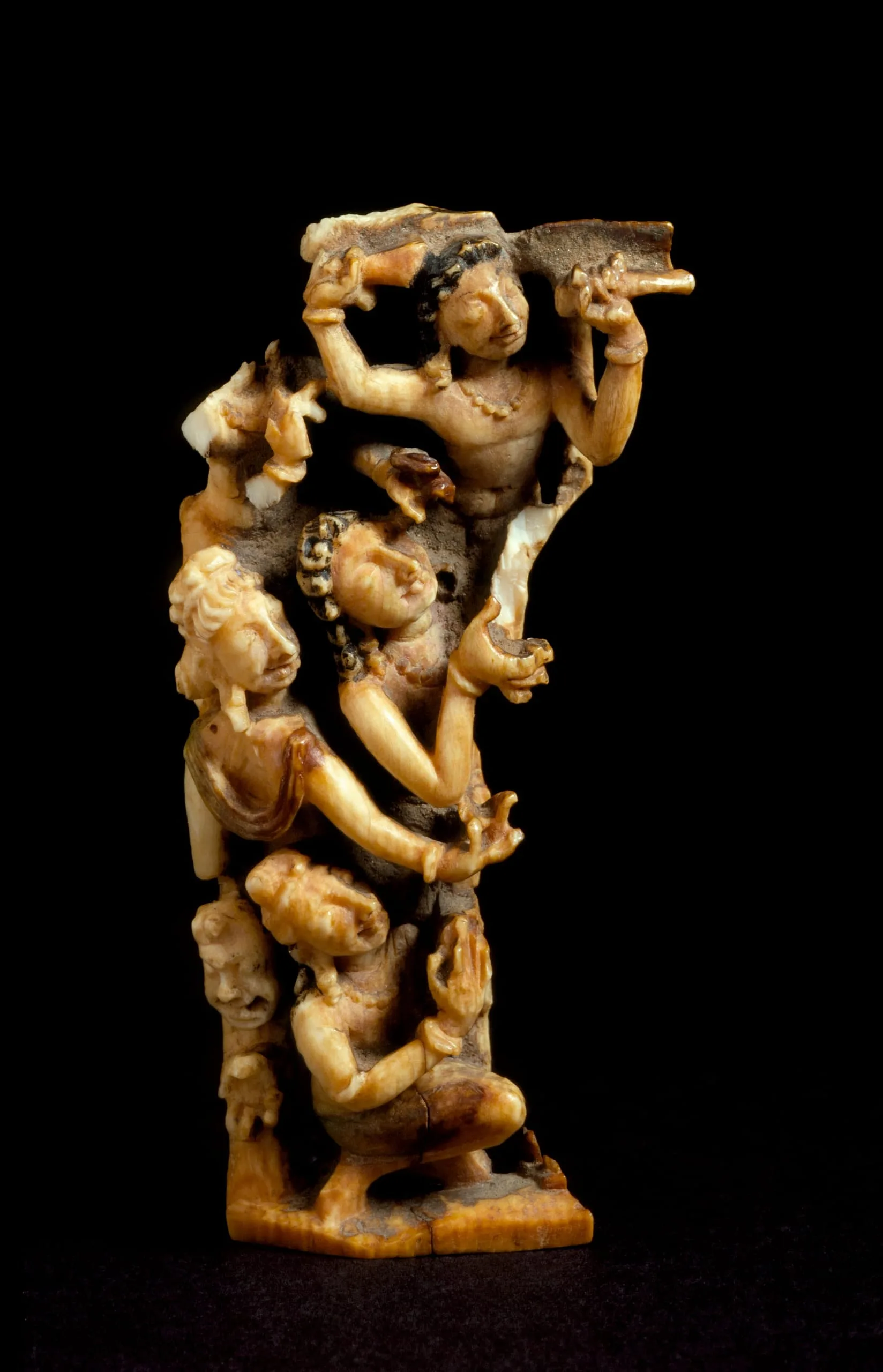 This fragment of figures from an openwork ivory panel may have originally been part of a Kashmiri Buddhist shrine depicting the Temptation of the Buddha by the demonic forces of Mara, the god of desire. Additional life scenes of the Buddha also served as the principal subject of such Kashmiri ivory shrines, which were typically triptychs in composition with flanking divinities or attendants. The ivory shrines were often encased in an architectural frame made of deodar wood.