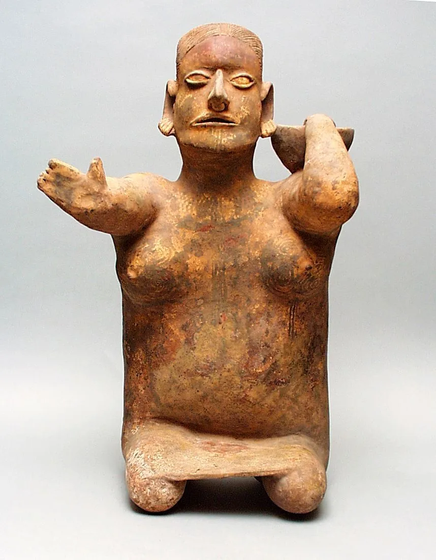 Terracotta ceramic figure of a kneeling, full-bodied human form with one arm raised behind the head and one arm extended outward, mottled orange and brown surface