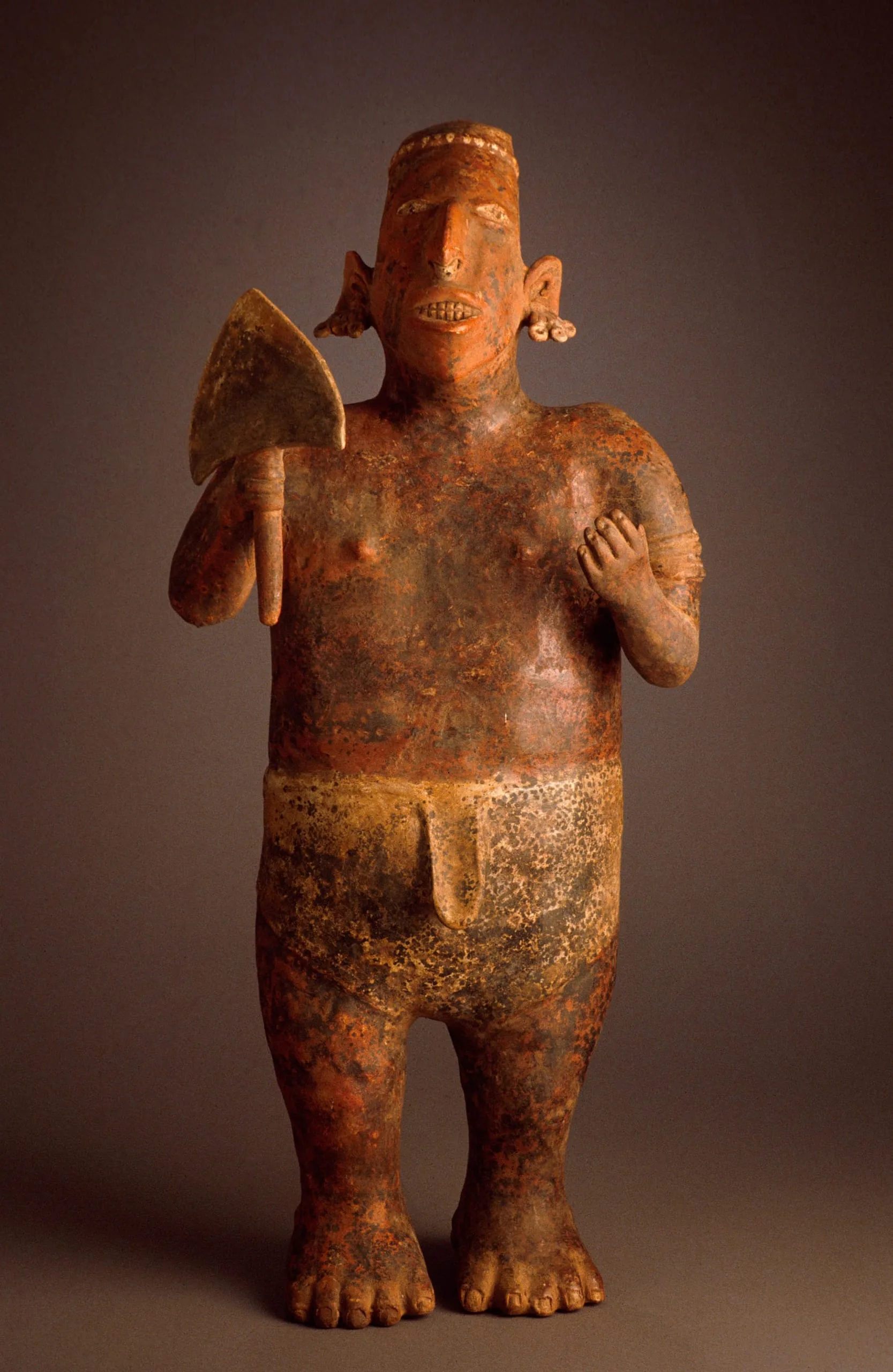 Large terracotta ceramic figure standing upright, holding an axe-like implement over one shoulder, with a broad face, open mouth showing teeth, and mottled reddish-brown surface