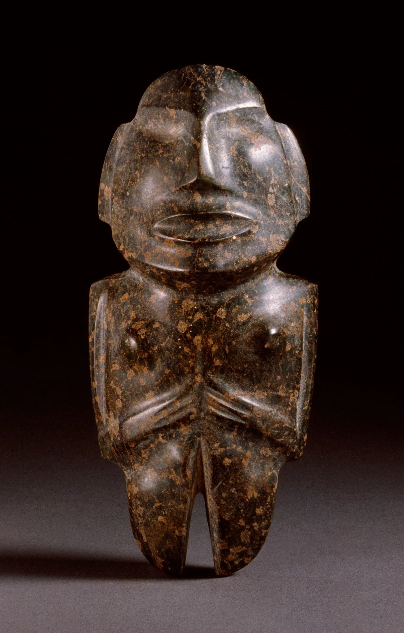 Small carved stone figurine of a standing human form with simplified features, polished dark green and black surface with rust-brown mineral flecks