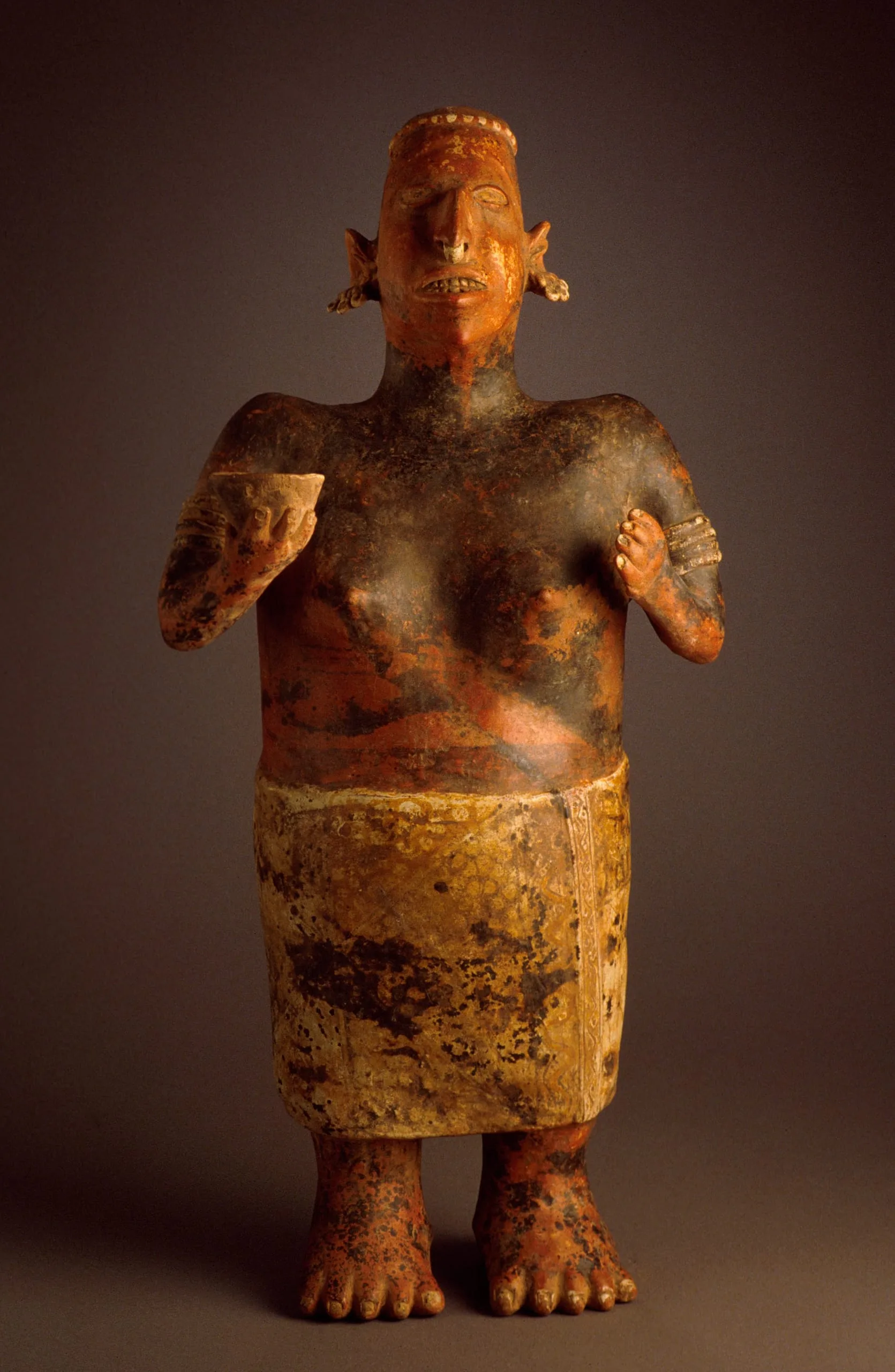 Terracotta sculpture of a standing full-length human figure with arms raised, holding a bowl, wearing a patterned skirt, with red, black, and amber pigment
