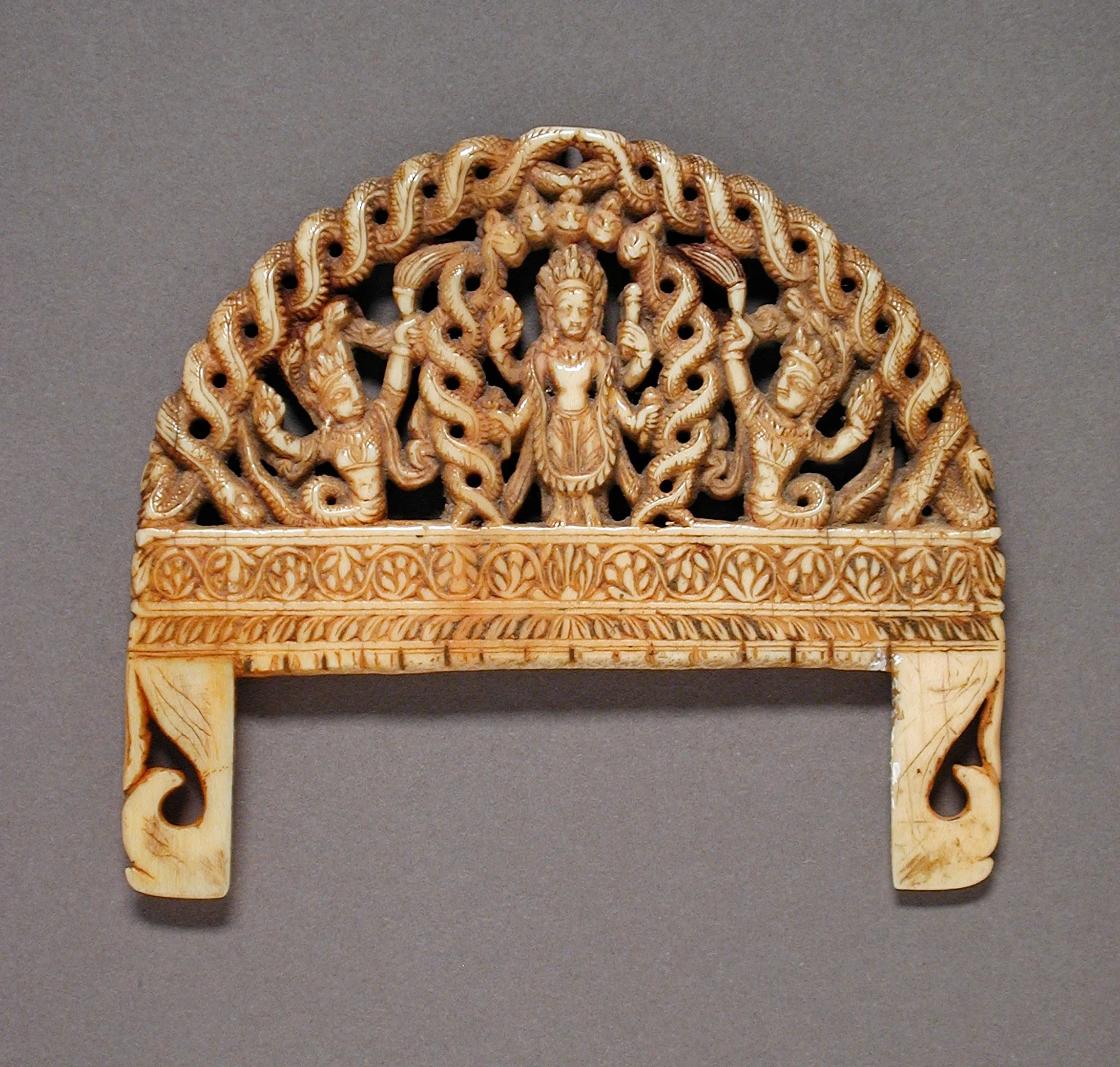 The pierced crescentic handle depicts the Hindu god Vishnu crowned and wearing a long forest garland (vana mala). He stands in a stiff, frontal pose (samapada sthanaka) under an aureole (prabhavali) of intertwining multihooded serpents. Vishnu has four arms bearing in his hands his standard attributes of a conch (lower right), discus (upper right), mace (upper left), and a lotus bud (lower left). Flanking him are serpent kings (naga rajas), each wearing a tiara and a coat of mail. They each waive an honorific flywhisk with their hand closest to Vishnu and hold a discus in their far hand. The handle is bordered above by an arch of intertwined serpents and below by two decorative bands. The upper band is a meandering vine with blossoms, while the lower band is lotus petals. The lower side flanges of the comb are in the form of stylized peacocks shown in profile. The back of the comb is carved in an identical design.