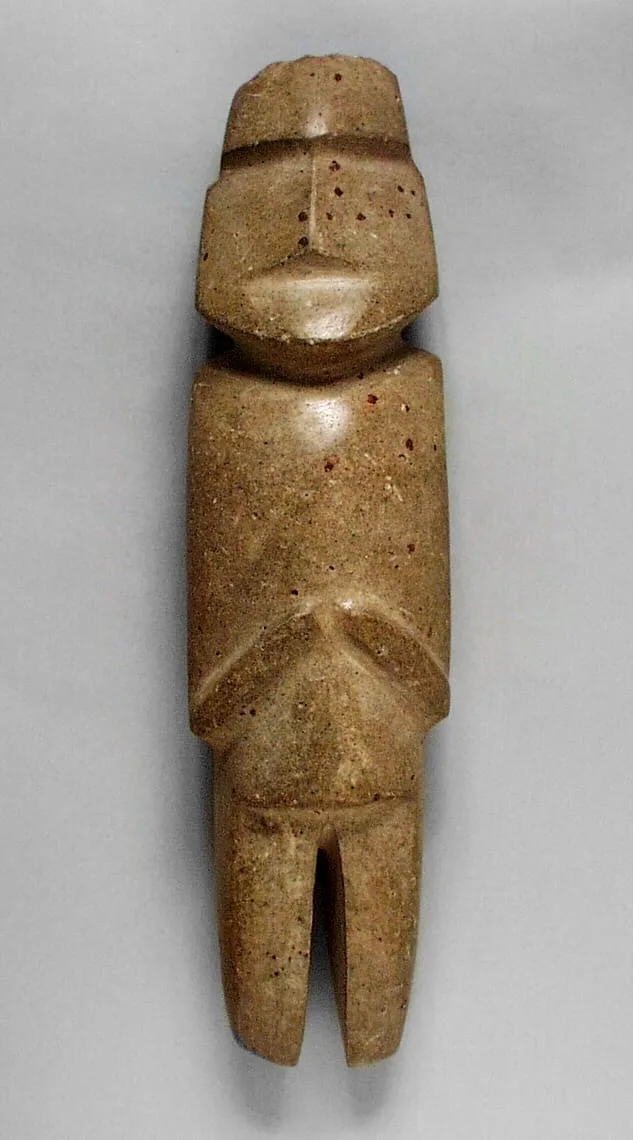Small stone figure with highly stylized, simplified human form; flat trapezoidal head, rectangular torso with incised lines suggesting arms, and short bifurcated legs; smooth tan stone surface with scattered small pits.