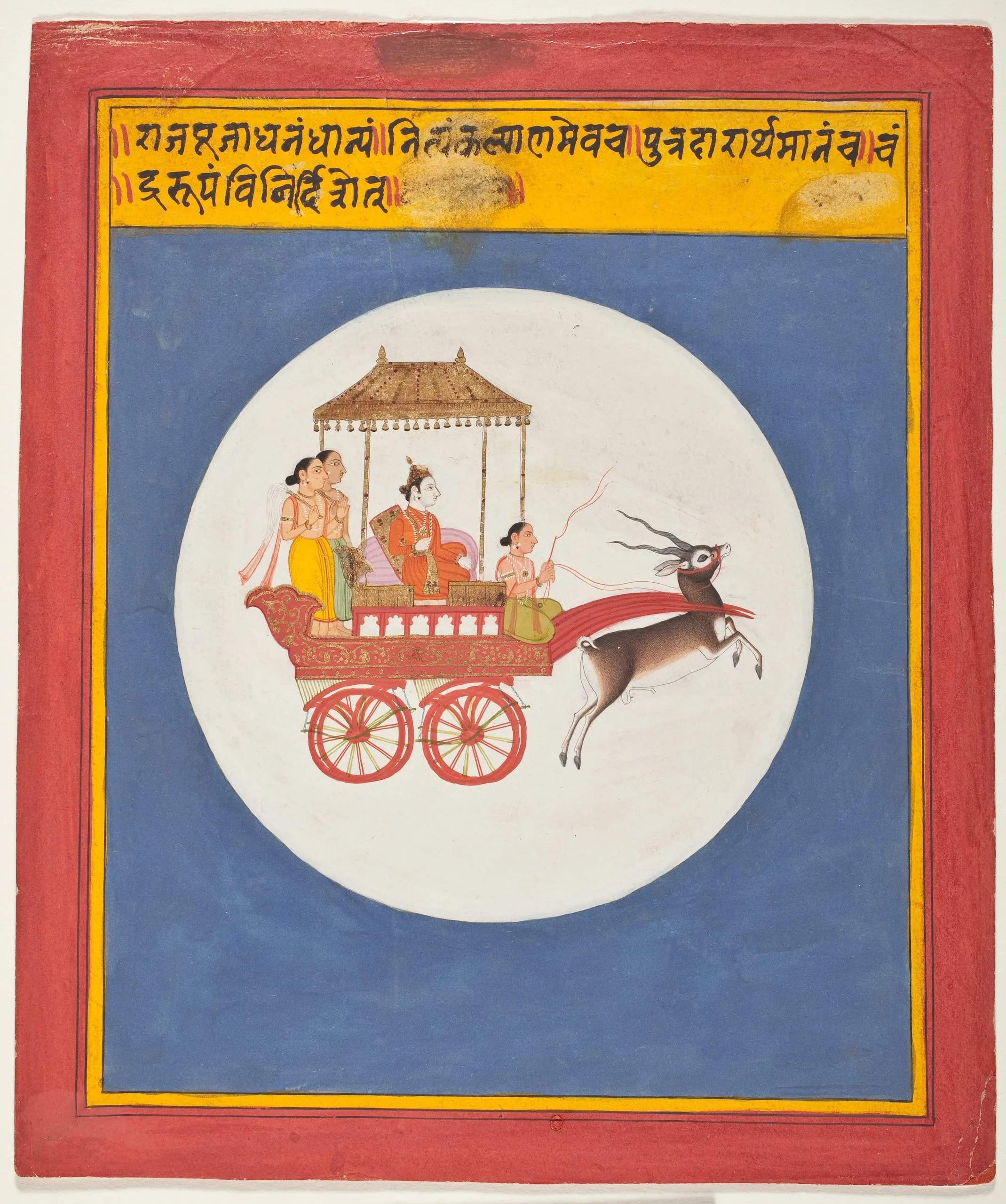 In front of a full moon that functions as his nimbus, the crowned Chandra rides in a chariot drawn by his iconographic attribute of an antelope. He is accompanied by a charioteer and two attendants bearing honorific fly whisks made from the white tail-hairs of a yak (cauri or chowri).