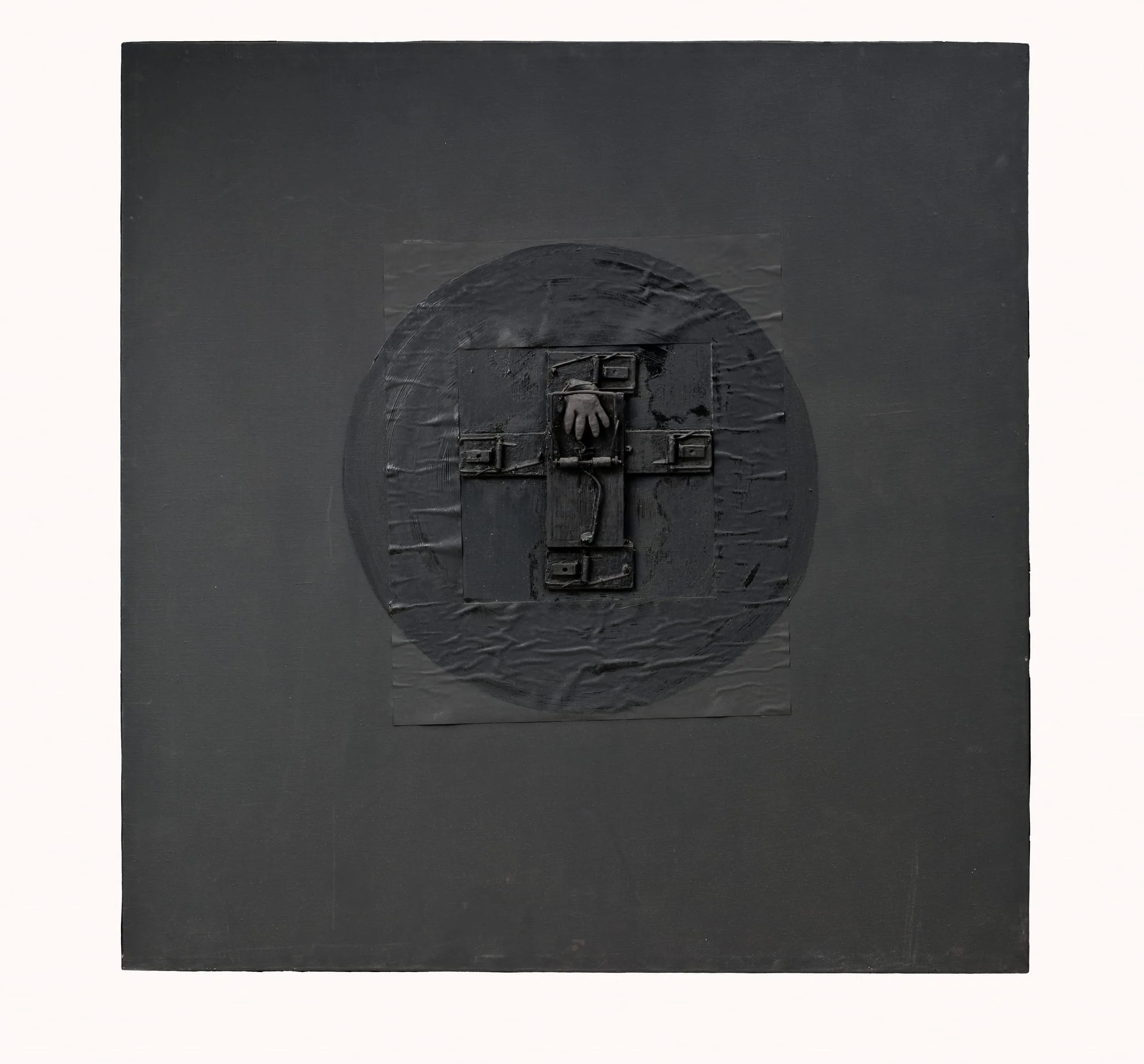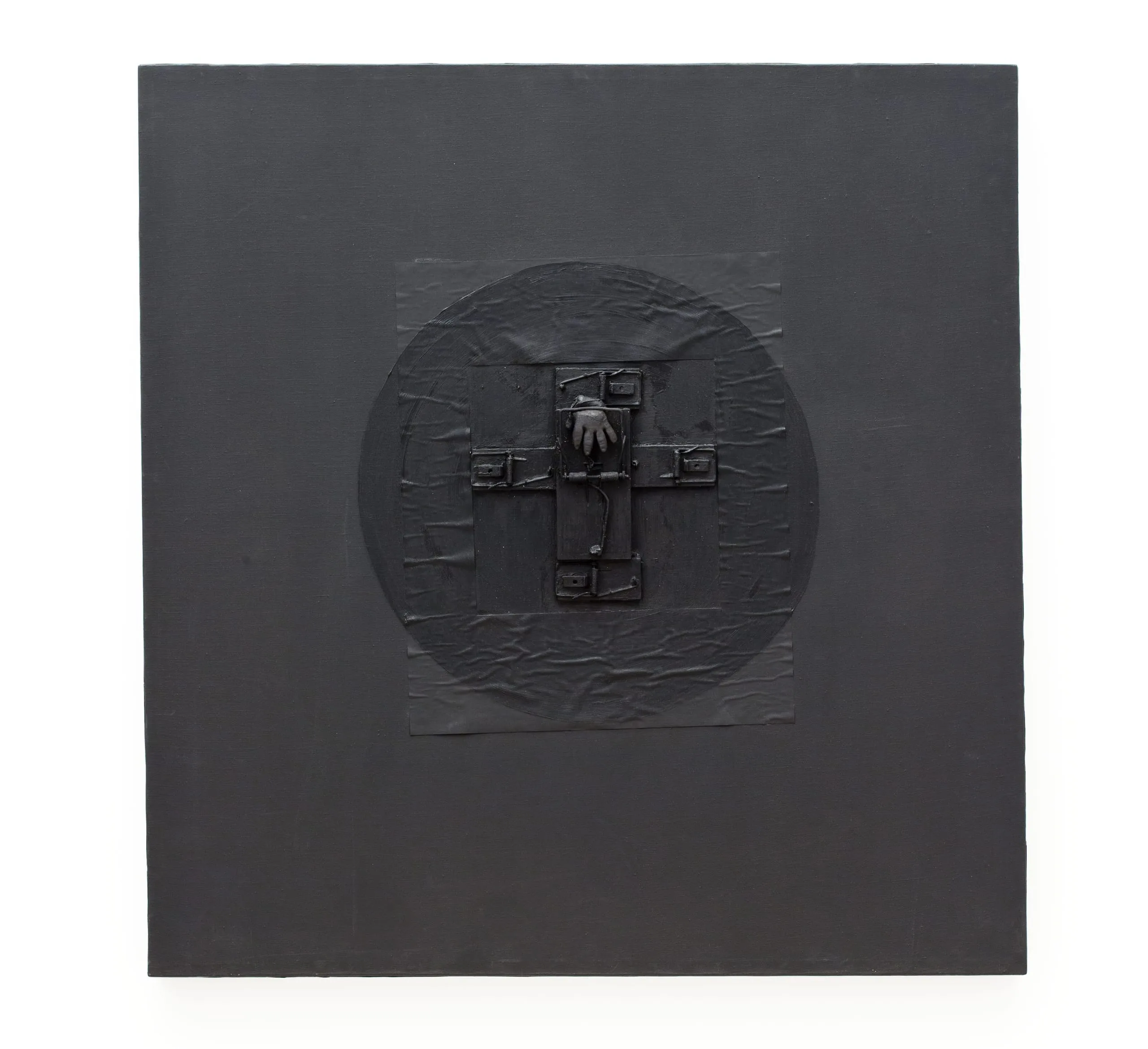 Daniel LaRue Johnson’s The Big Steal #1 is an early example of the artist’s Black Constructions, which comprises found objects such as mouse traps, broken figurines, wire fencing, and various pieces of ephemera arranged in the center of square wooden boxes and coated in black paint or tar. Made in Los Angeles between 1961 and 1965 during the height of the Civil Rights movement, these assemblages reference the systemic racism and violence towards Black Americans that marked the era. Here, five mouse traps form a cross, with a disembodied doll hand caught in the largest of the spring-loaded metal snares. Set within a painted black circle and a wrinkled paper square, these multiple framing devices reinforce a sense of entrapment.