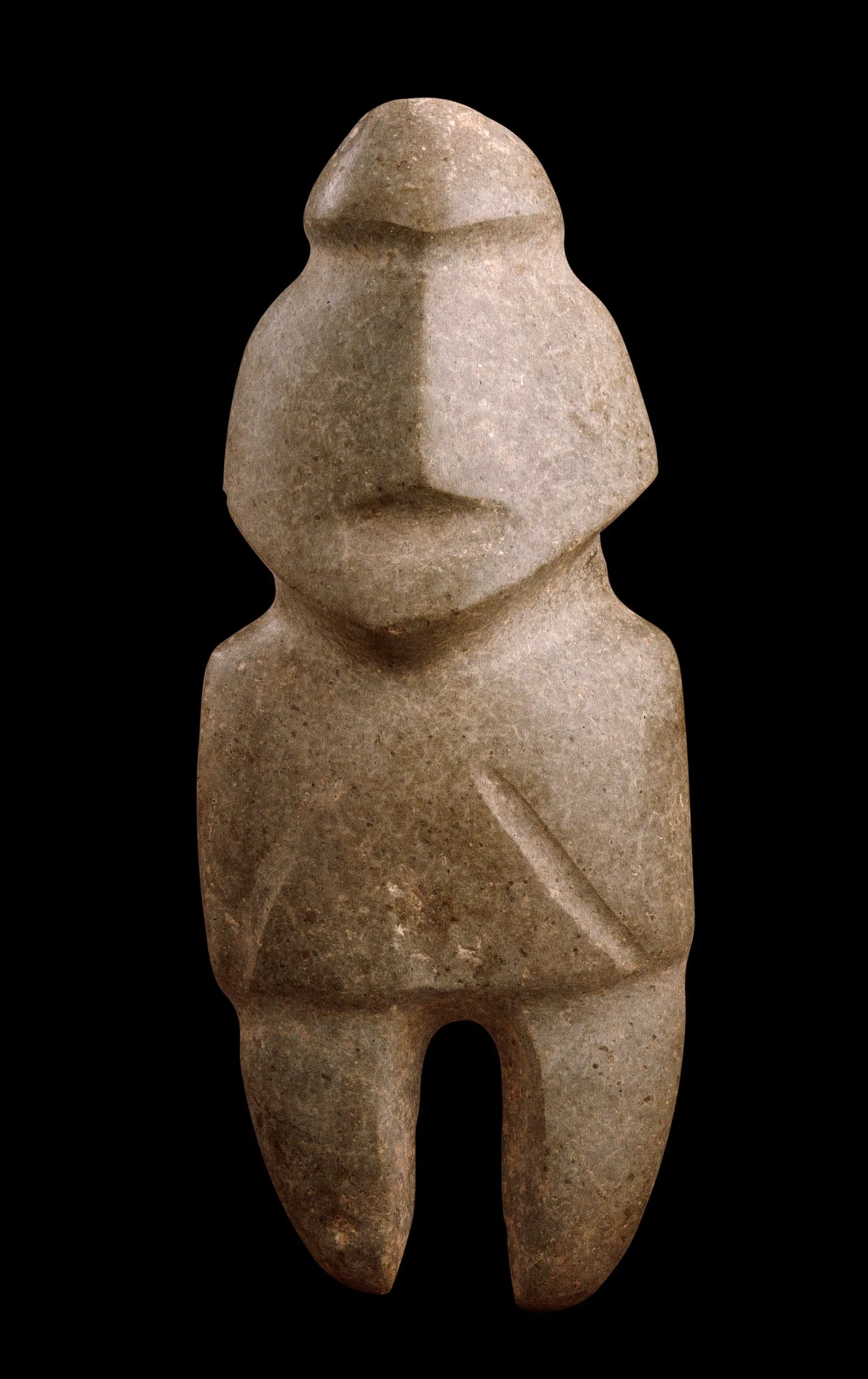 Small carved stone figurine of a stylized standing human form with a rounded head, incised facial features, crossed lines on the chest, and two stubby legs