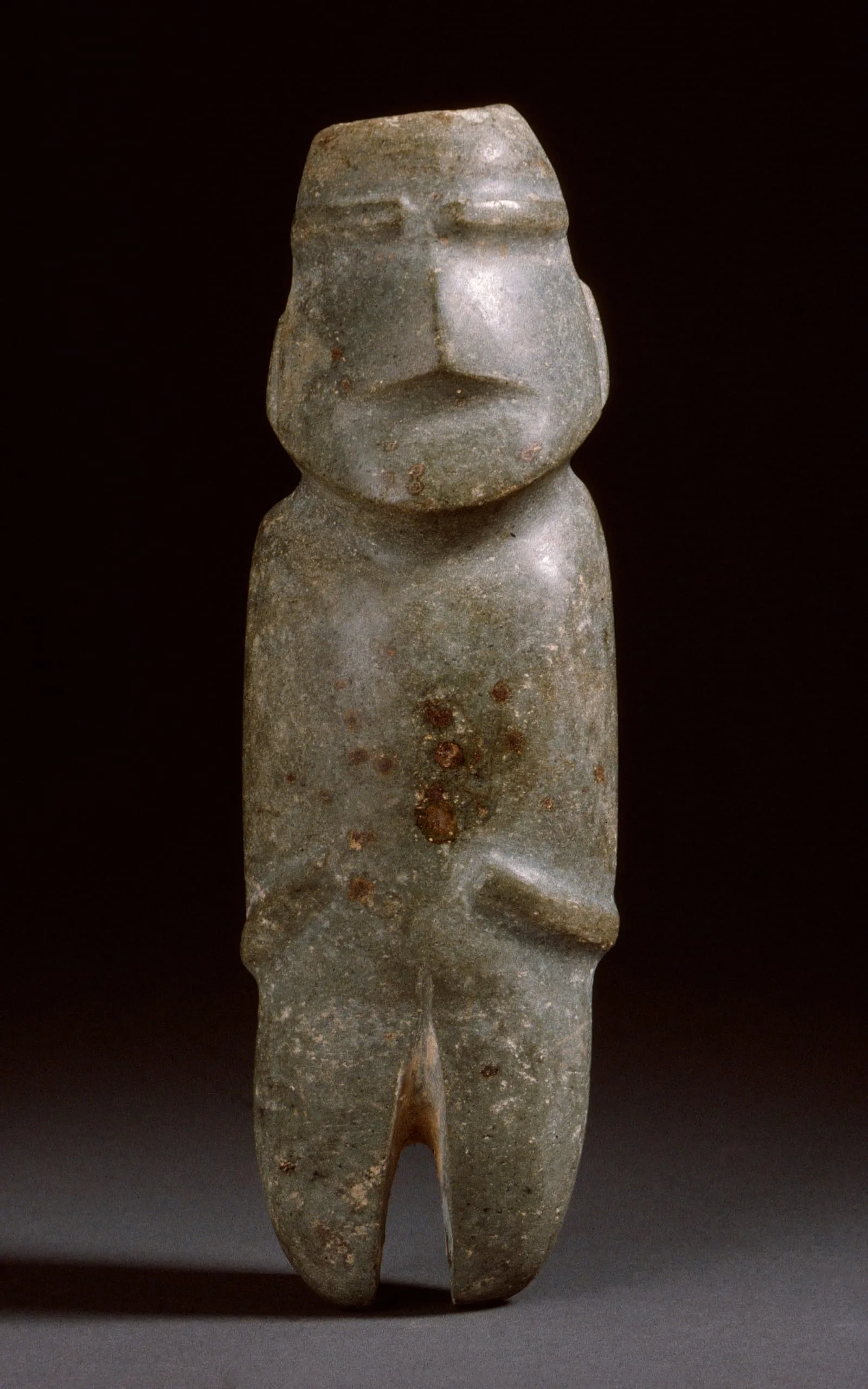 Small stone sculpture of a simplified standing human figure in sage green stone with rust-orange mineral deposits, with a blocky head, minimal facial features, and columnar legs