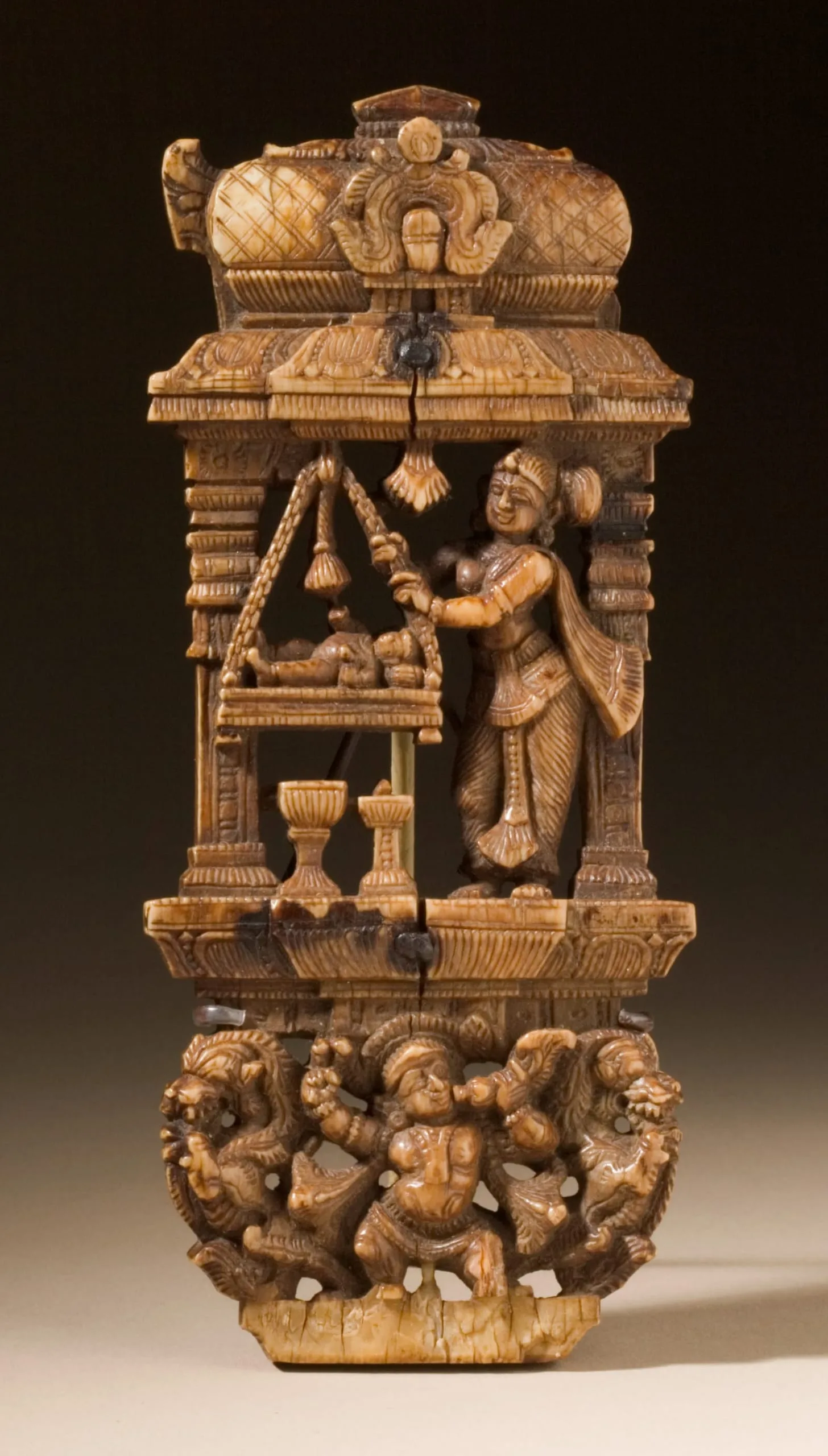 Madurai, the principal capital of the Nāyak Dynasty (1529–1736) in Tamil Nadu, is renowned for its temple and palatial architecture, especially under the reign of the illustrious King Tirumala Nayaka (r. 1623–1659). It was also an important center for the pictorial and decorative arts, particularly painting and ivory carving. In addition to freestanding ivory representations of royal and amorous couples, Hindu deities, and religious personages, sets of ivory plaques carved in low-relief or openwork were used to adorn furniture (principally jewelry boxes and thrones) and palatial portals.