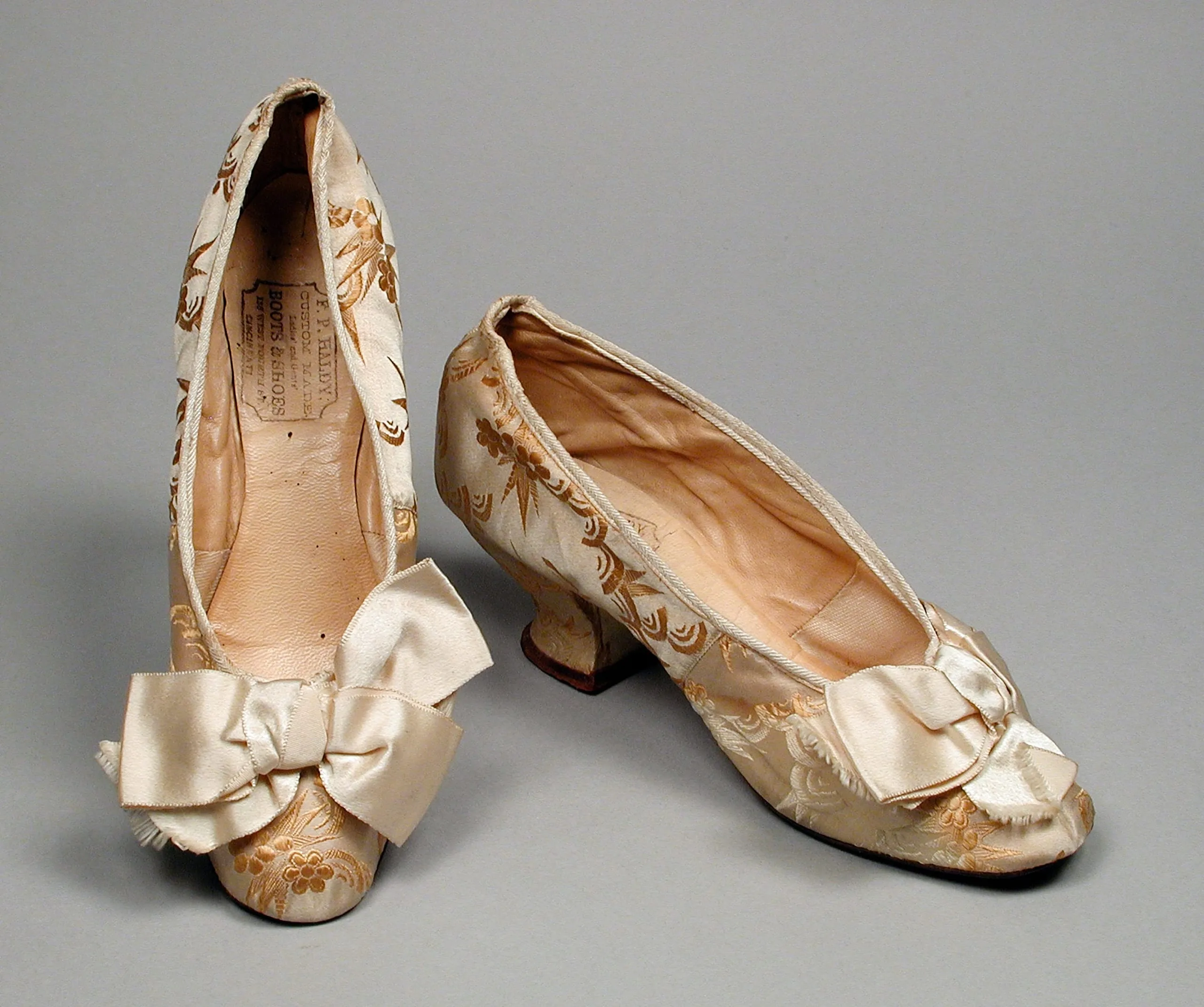 - Silk satin with silk supplementary weft patterning and leather with silk satin ribbon