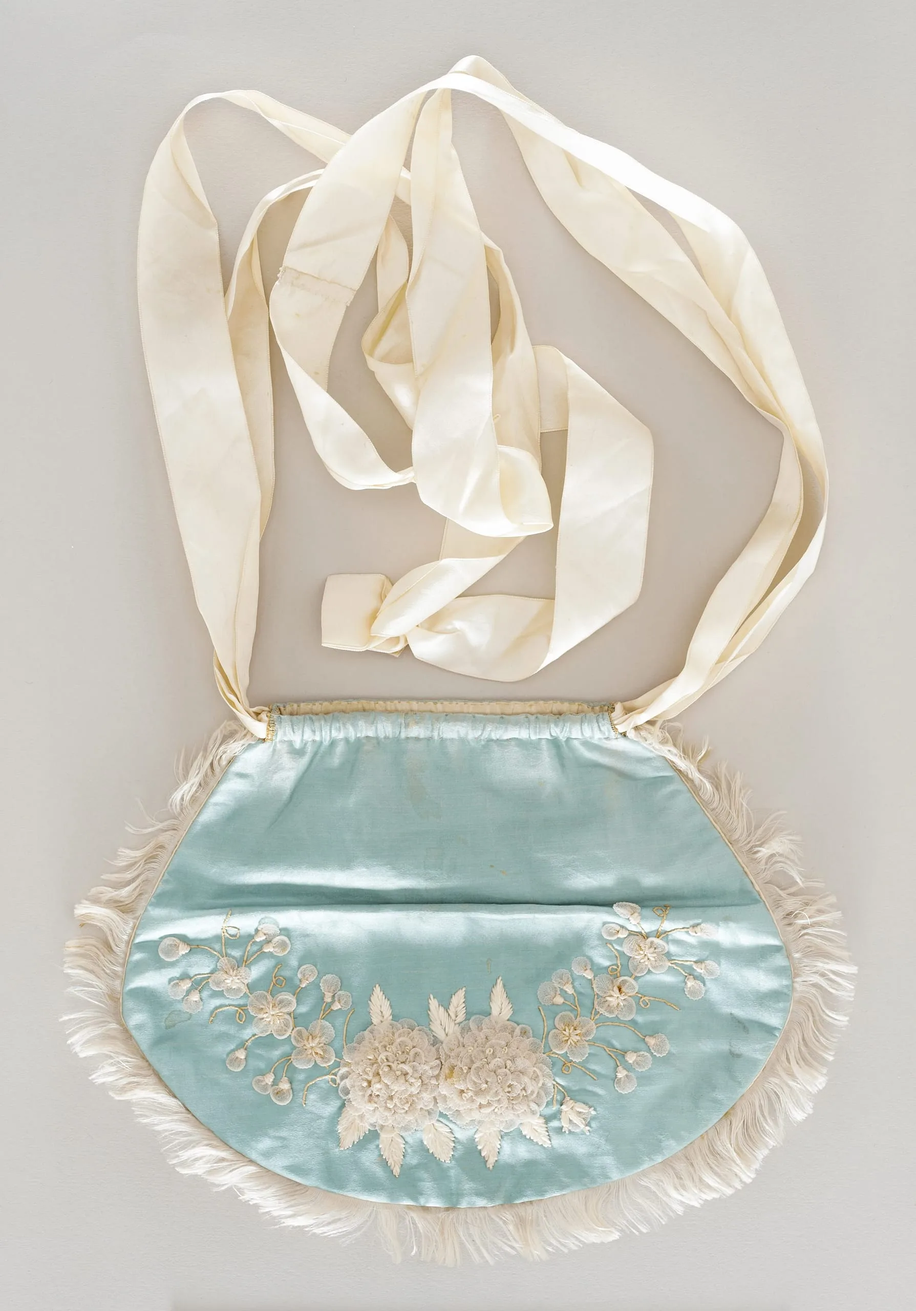 - Silk satin with silk embroidery, bast ribbonwork, silk fringe, and silk satin ribbons