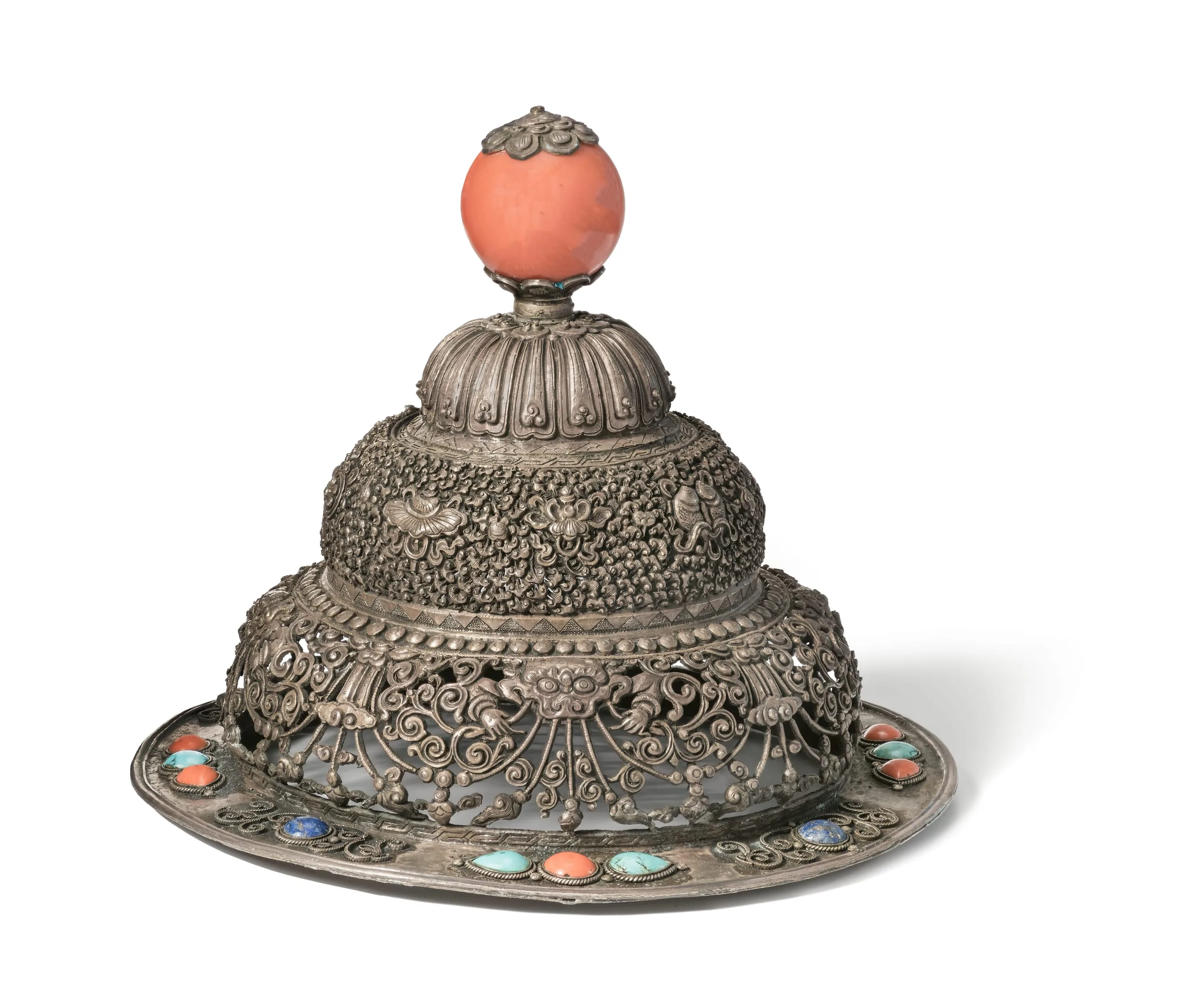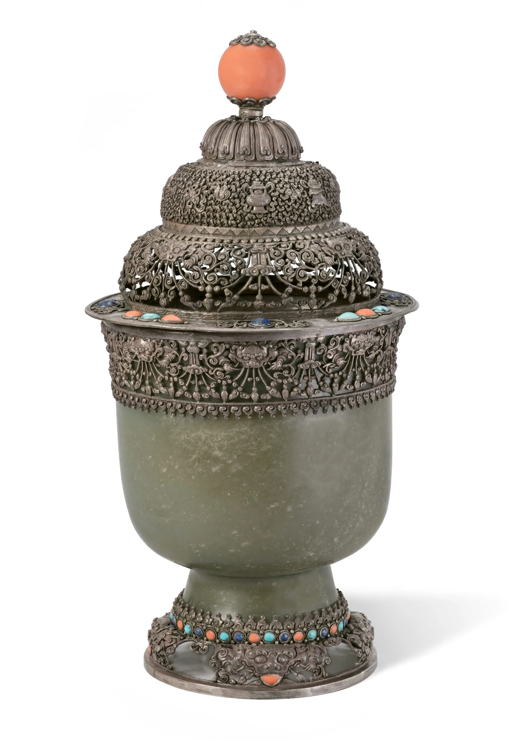This exceptional Ceremonial Urn was fashioned from a single block of mottled green nephrite jade that was hollowed out to make the body of the urn in the form of a pedestal vase with a splayed foot. It has a silver and pierced silver tiered domed cover with a flat, horizontal rim and pendant bezel, which is a characteristic of Chinese ceramic export ware. The rim is inlaid with triple groupings of coral and turquoise cabochons or petal forms alternating with a single lapis lazuli. The silver dome is surmounted by a glass finial replicating coral with silver lotus petal fittings. The first two tiers are solid while the third tier is openwork. Geometric motifs adorn the dividing bands between tiers. The first tier is in the form of lotus petals. The second tier has a dense floral background interspersed with the Eight Auspicious Symbols (ashta mangala) of Buddhism. The third tier has a pierced scrolling vine adorned with the face of a mythical animal (Chinese: taotie, Tibetan: zipac), which an apotropaic symbol akin to the Indian "Face of Glory" (kirttimukha). The faces alternate with pendant swags. The upper edge of the jade body is embellished with a lace-work collar similar to the third tier designs. The base is a silver and gemstone collar encircling the splayed foot that is set above an open work tier with four mythical animal faces with inlaid coral.