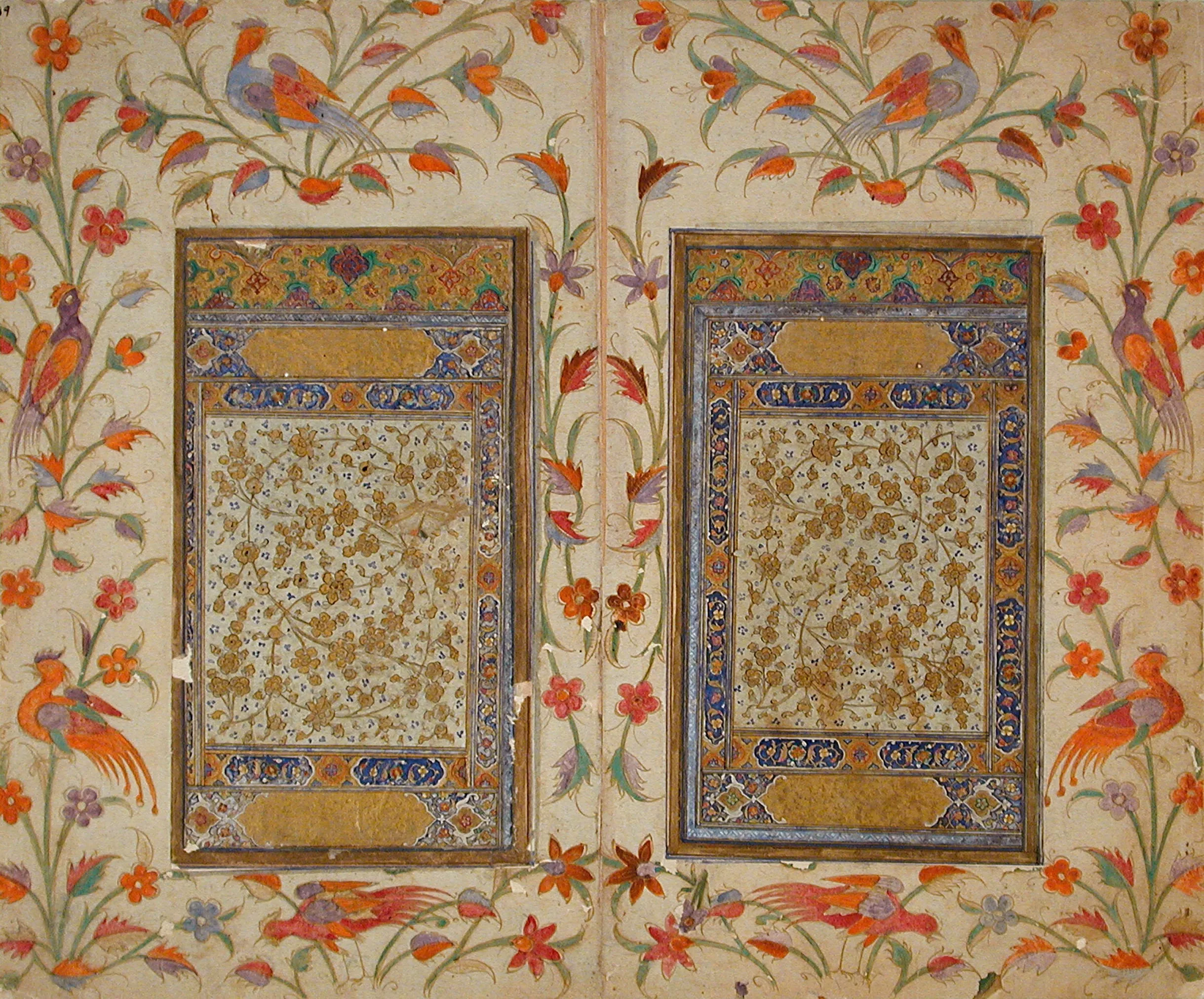 The central panels are flowering vines with gold and blue blossoms. The panels are surrounded by predominately gold and blue margins with arabesque designs and blind cartouches that may have been intended for titles. The mirror-image borders feature simurghs (mythical avian creatures of Persia) perched in flowering plants. The brilliant palette of red, orange, green, purple, and blue typifies Deccani pictorial exuberance.