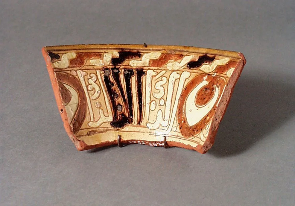 Ceramic bowl fragment with brick-red clay body, cream slip interior, and large-scale Arabic script in reddish-brown luster glaze with bold black vertical strokes