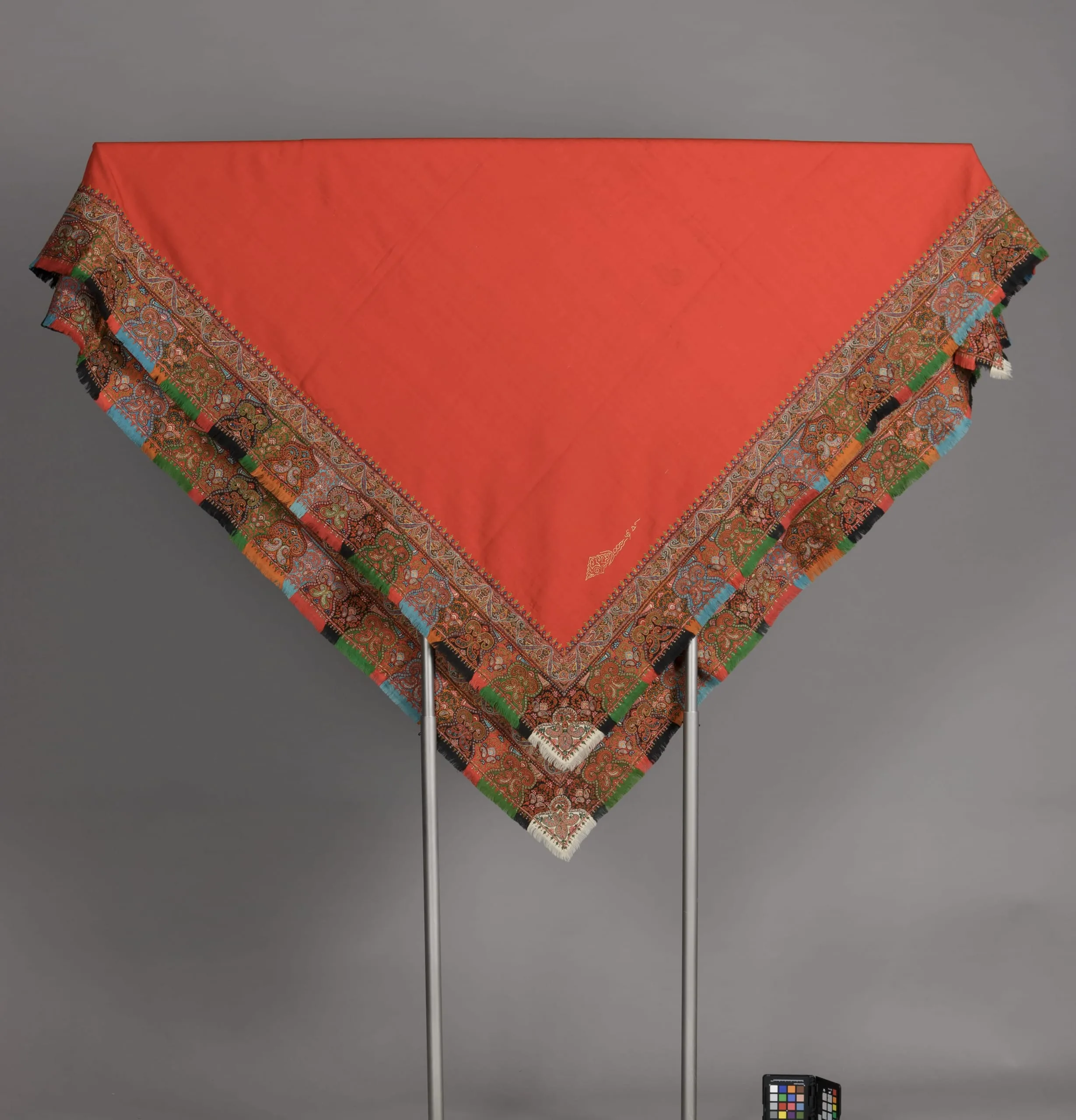 Triangular folded textile with a solid tomato-red field and wide multicolored paisley and floral border in burgundy, sky blue, green, and orange blocks, displayed on metal stands