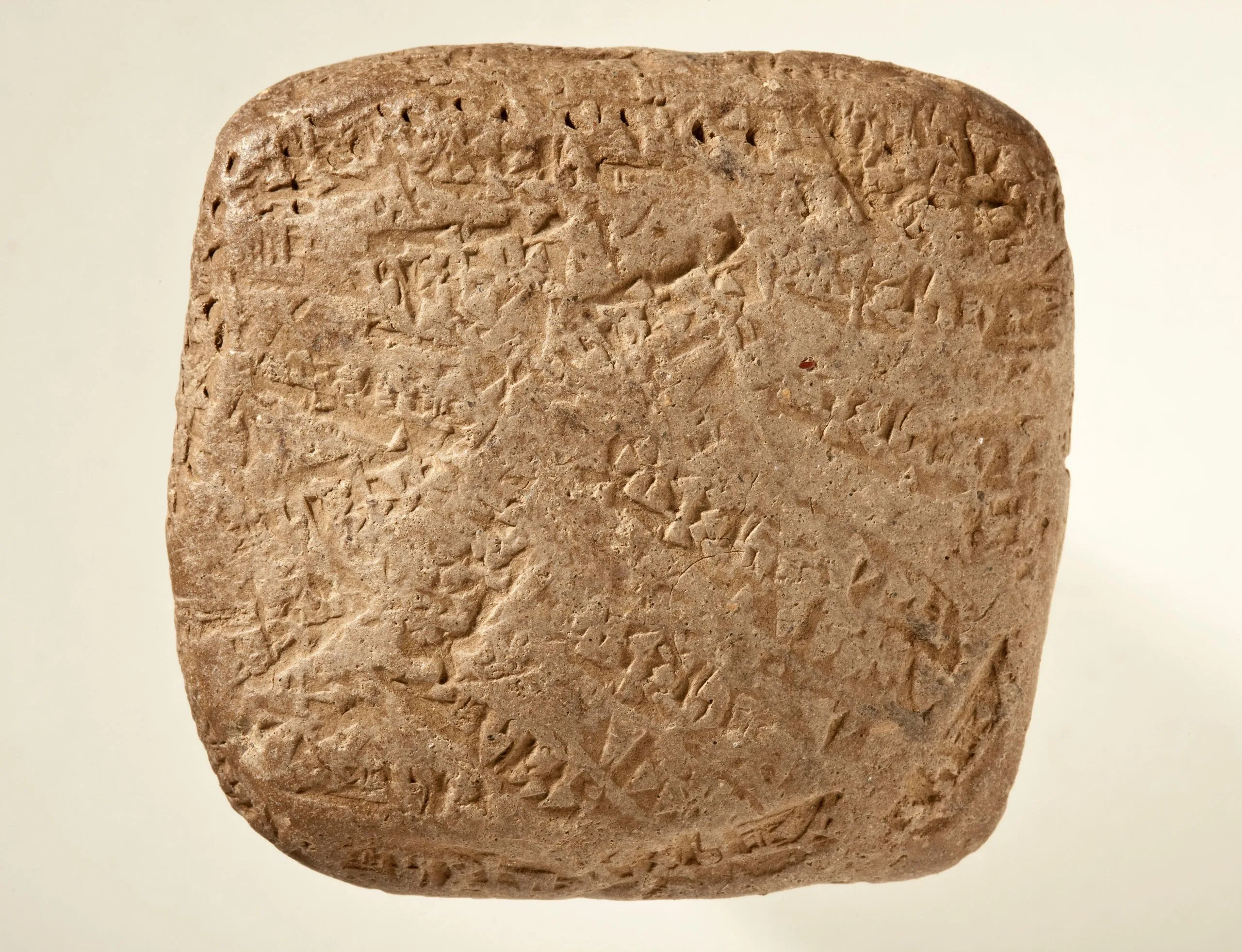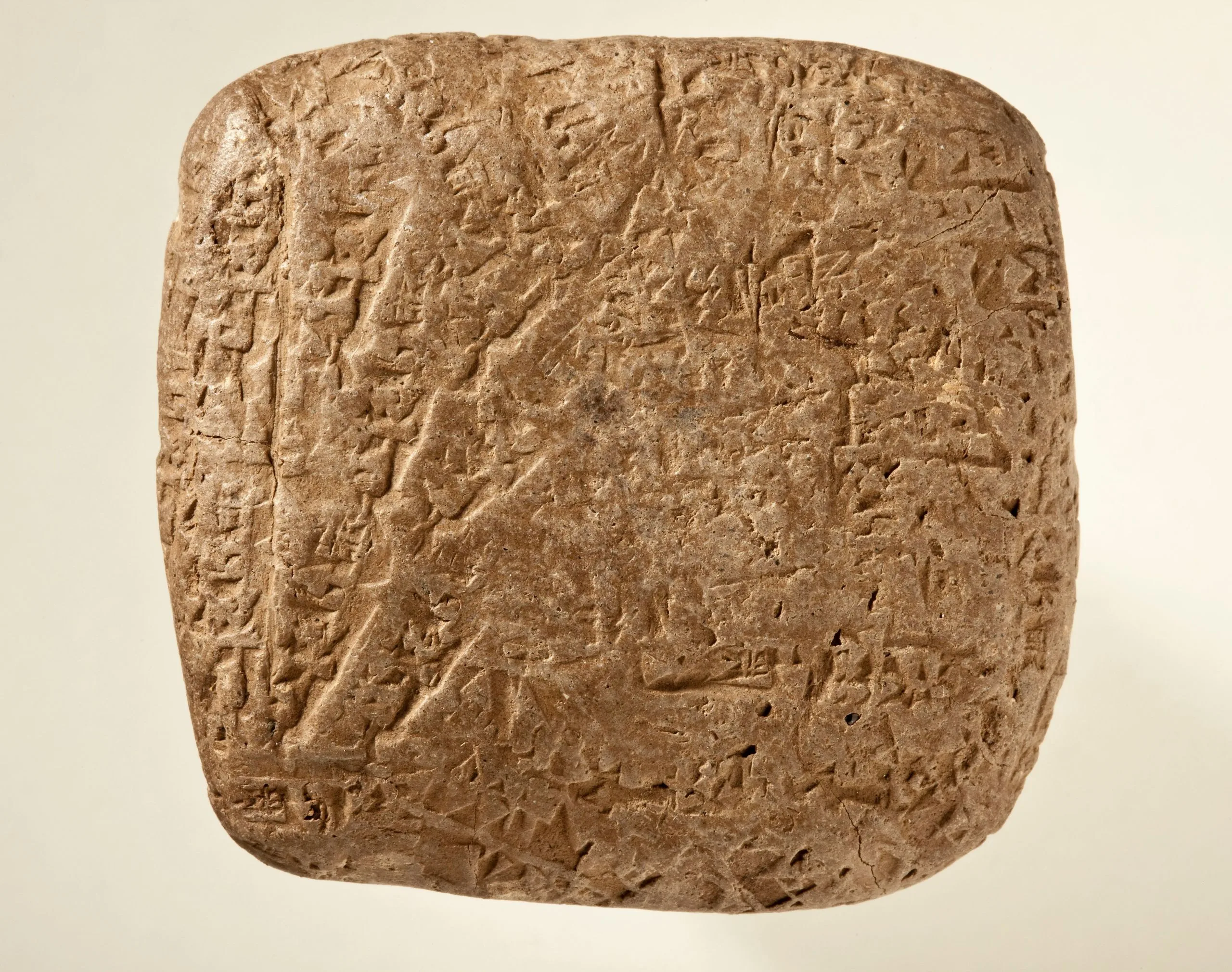 Clay tablet with rounded corners covered in dense cuneiform script impressed across the entire surface, in warm terracotta brown
