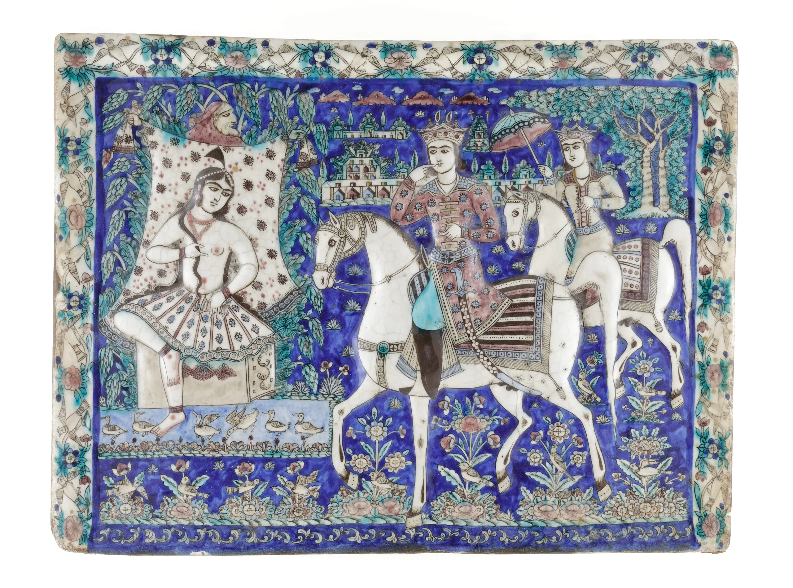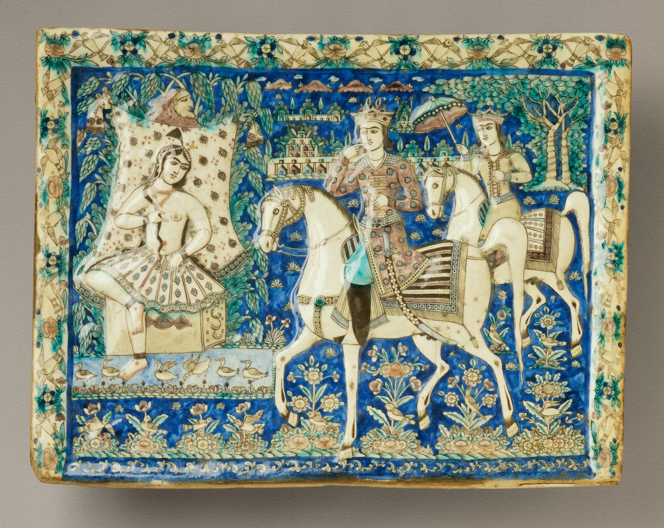 This tile depicts Khusraw and Shirin, the protagonists of the twelfth-century Persian romance by Nizami, meeting in a garden filled with birds, flowers, and foliage. The scene of the lovers’ encounter was frequently represented from medieval times onward, but in this version the artist updates the classic story by clothing Shirin in the tutu-like skirt popular in courtly circles in later nineteenth-century Iran. Tiles such as this one were the most widespread form of architectural decoration in Iran under the Qajars (1785–1925), adorning the walls of palaces, private residences, bazaars, and gates, where they added both color and narrative to the spaces.