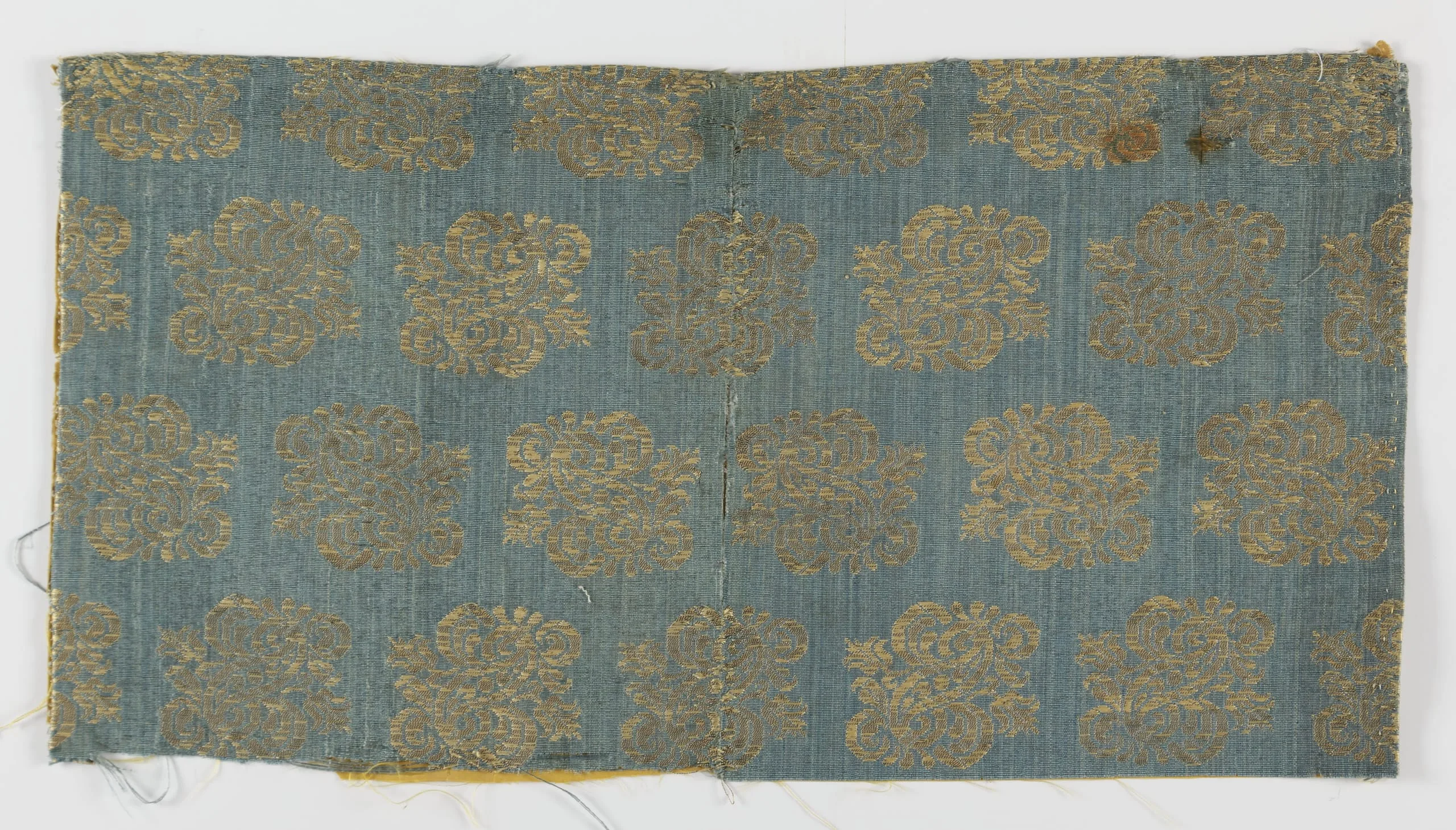 - Silk plain weave (faille) with metallic-thread weft patterning and metallic-thread discontinuous supplementary-weft patterning (brocade)