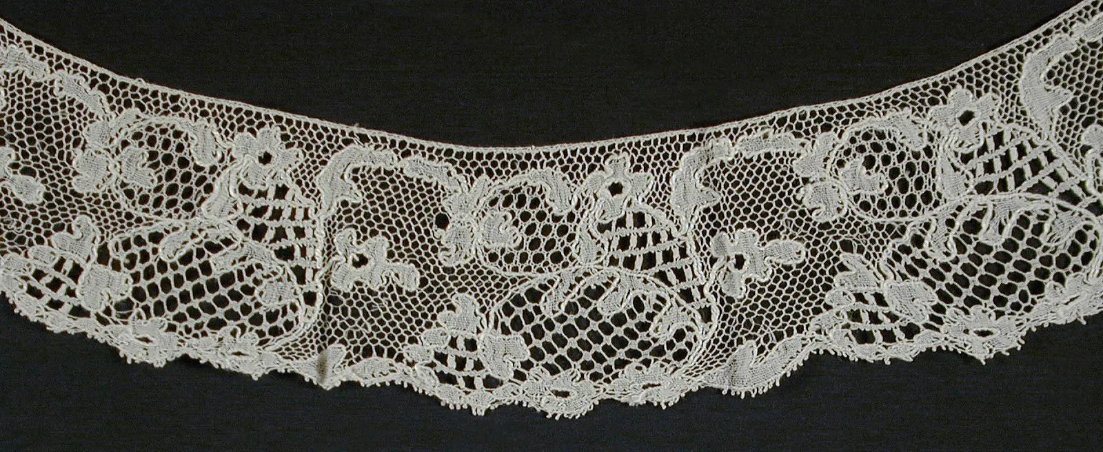 Cream-white lace collar displayed flat on black background, with scrolling floral motifs on a hexagonal mesh ground and scalloped lower edge