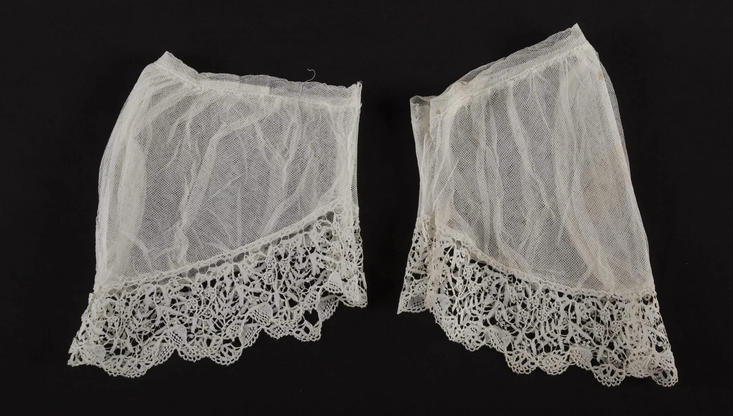 Pair of ivory white textile cuffs or sleeve ruffles, each with an open-mesh net upper section and a wide scalloped lace border along the lower edge, displayed against a black background