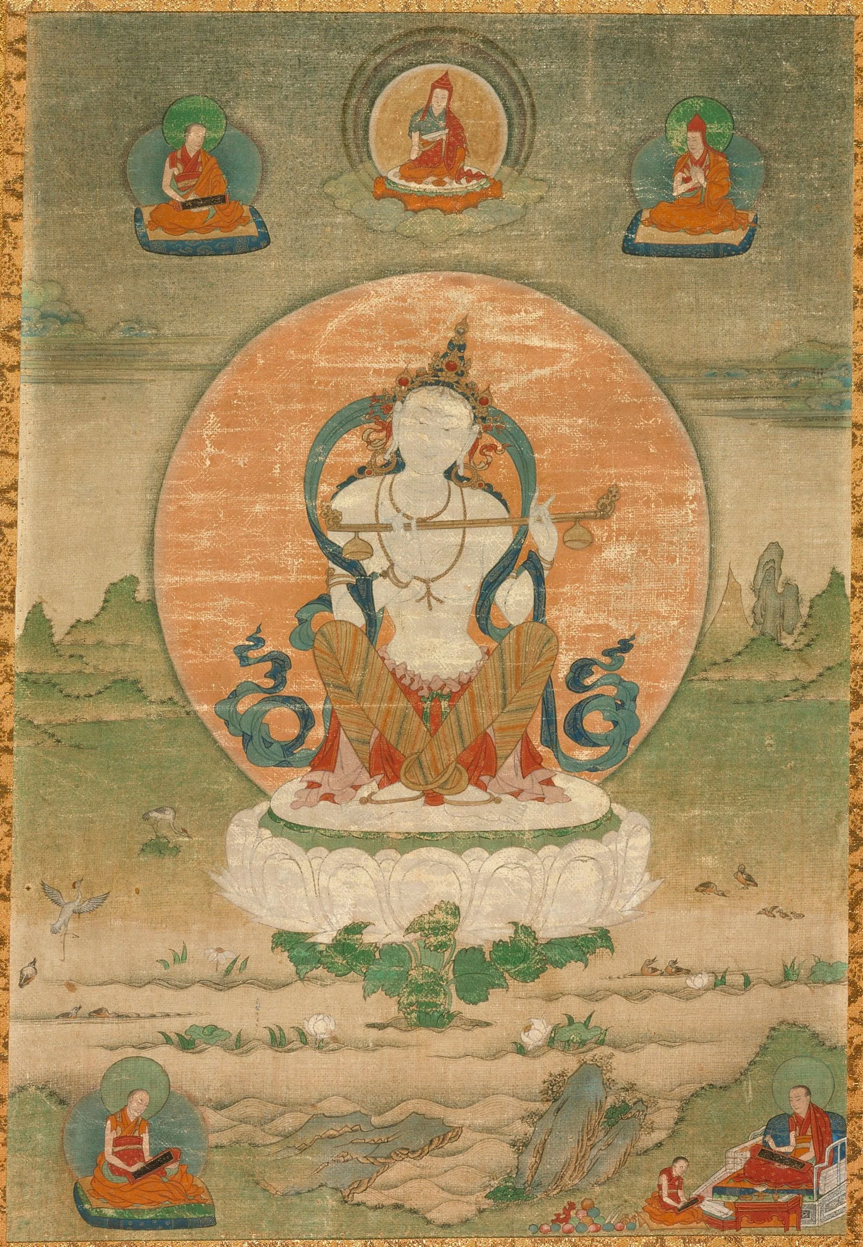 Venerated by Jains, Hindus, and Buddhists alike, Sarasvati (or Saraswati) is the goddess of knowledge, learning, speech, poetry, and music. Her reverence began in the early Vedic (proto-Hindu) period (circa 1500-1000 BCE) when she was worshipped in the Rigveda (Knowledge of Hymns) as the river goddess of the mythological Sarasvati River imagined as having once flowed in northwestern India. As Sarasvati carries her principal attribute of a vina regardless of her sectarian affiliation, the religious context of a given image of Sarasvati can be generally determined by its iconographic program and geo-historical origin. Accordingly, that this painting depicts a Buddhist Saraswati is evidenced by the presence of the five Sakypa monks surrounding the goddess. For examples of Hindu and Jain images of Sarasvati, see M.91.294.1 and M.86.83 respectively. This elegant representation of Sarasvati is believed to have been designed and commissioned by Situ Panchen (1700-1774), the renowned Buddhist master, scholar, patron, and artist in the Karma Kagyu school in Derge, Kham. See David P. Jackson, Patron and Painter: Situ Panchen and the Revival of the Encampment Style (New York: Rubin Museum of Art, 2009), pp. 115-116, no. 6.3.