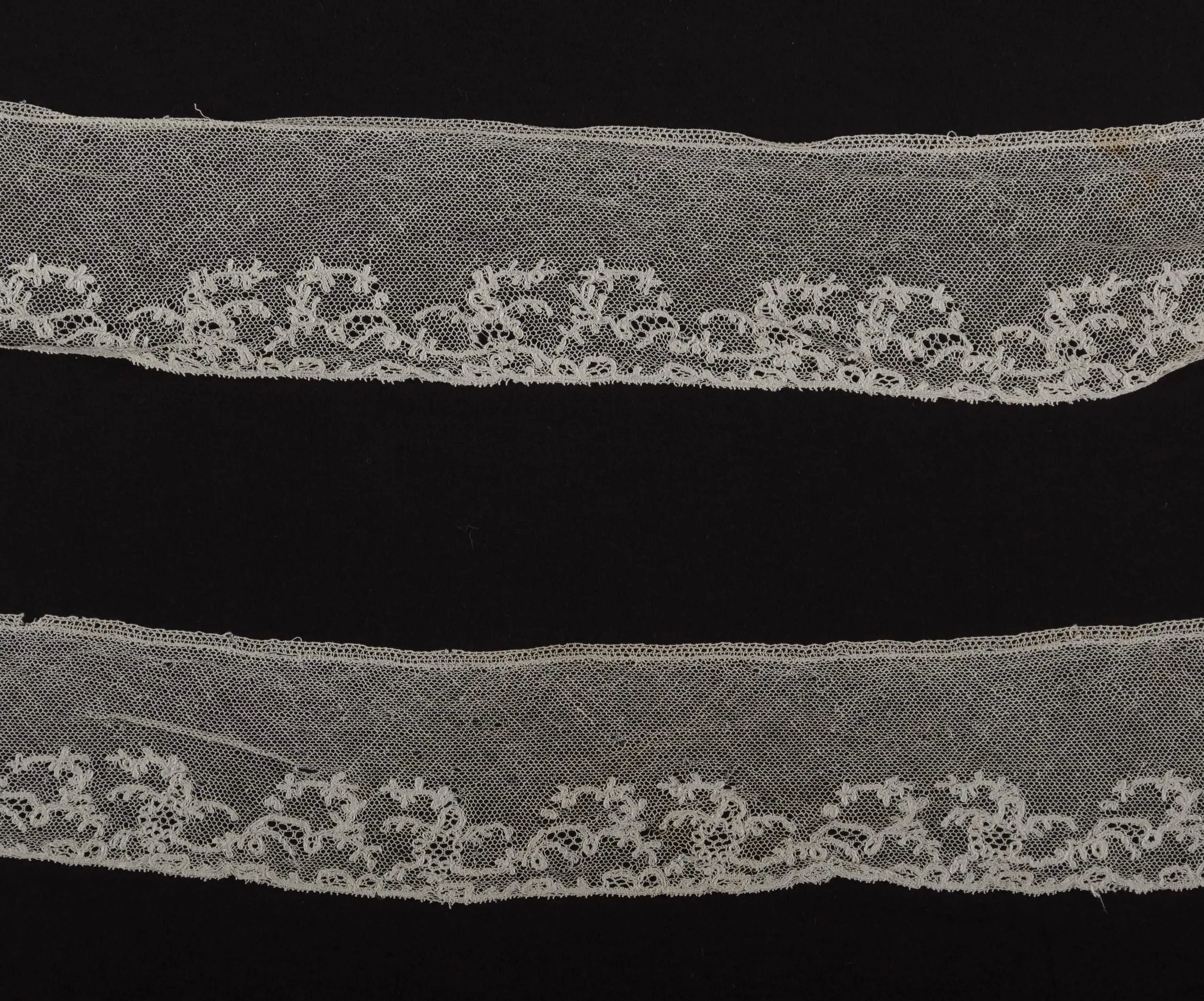 Two horizontal strips of cream-colored bobbin or needle lace with floral and foliate motifs along a sheer mesh ground, displayed against a black background