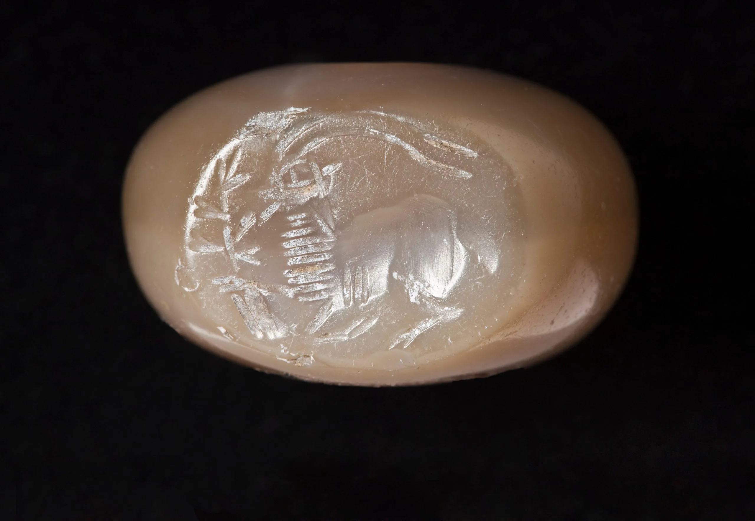 Small oval gemstone seal, possibly agate, with an intaglio carving of a scarab beetle flanked by plant motifs, cream and peach-toned stone against a black background