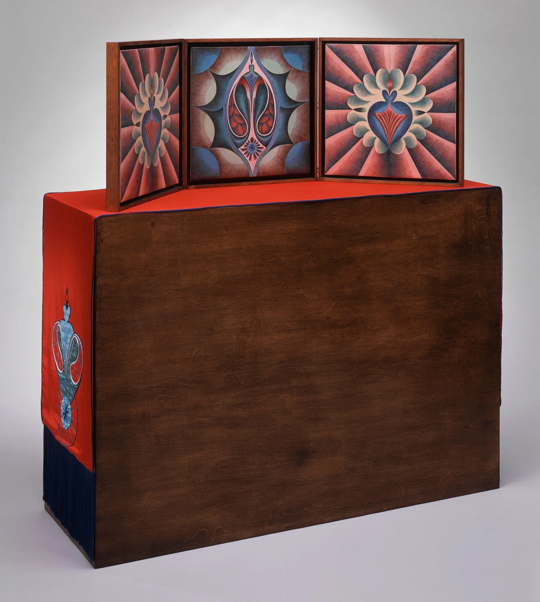 - Each panel unframed: 17 3/4 x 17 3/4 in. (45.09 x 45.09 cm); base: 56 x 40 x 20 in. (142.2 x 101.6 x 50.8 cm); each panel framed: 19 3/4 x 19 3/4 in. (50.17 x 50.17 cm); cloth: 115 x 20 in. (292.1 x 50.8 cm); fringe: 10 in. (25.4 cm)