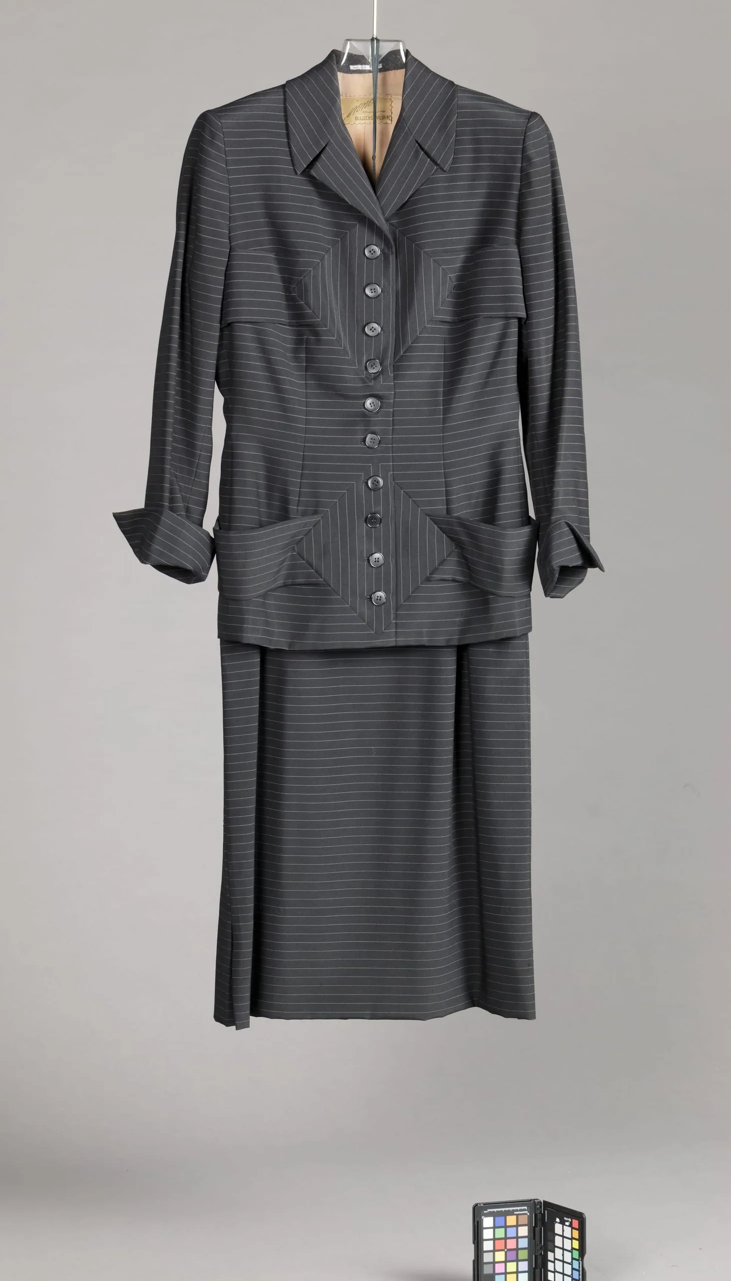 - Jacket: Wool/silk plain weave, plastic buttons. Skirt: Wool/silk plain weave.