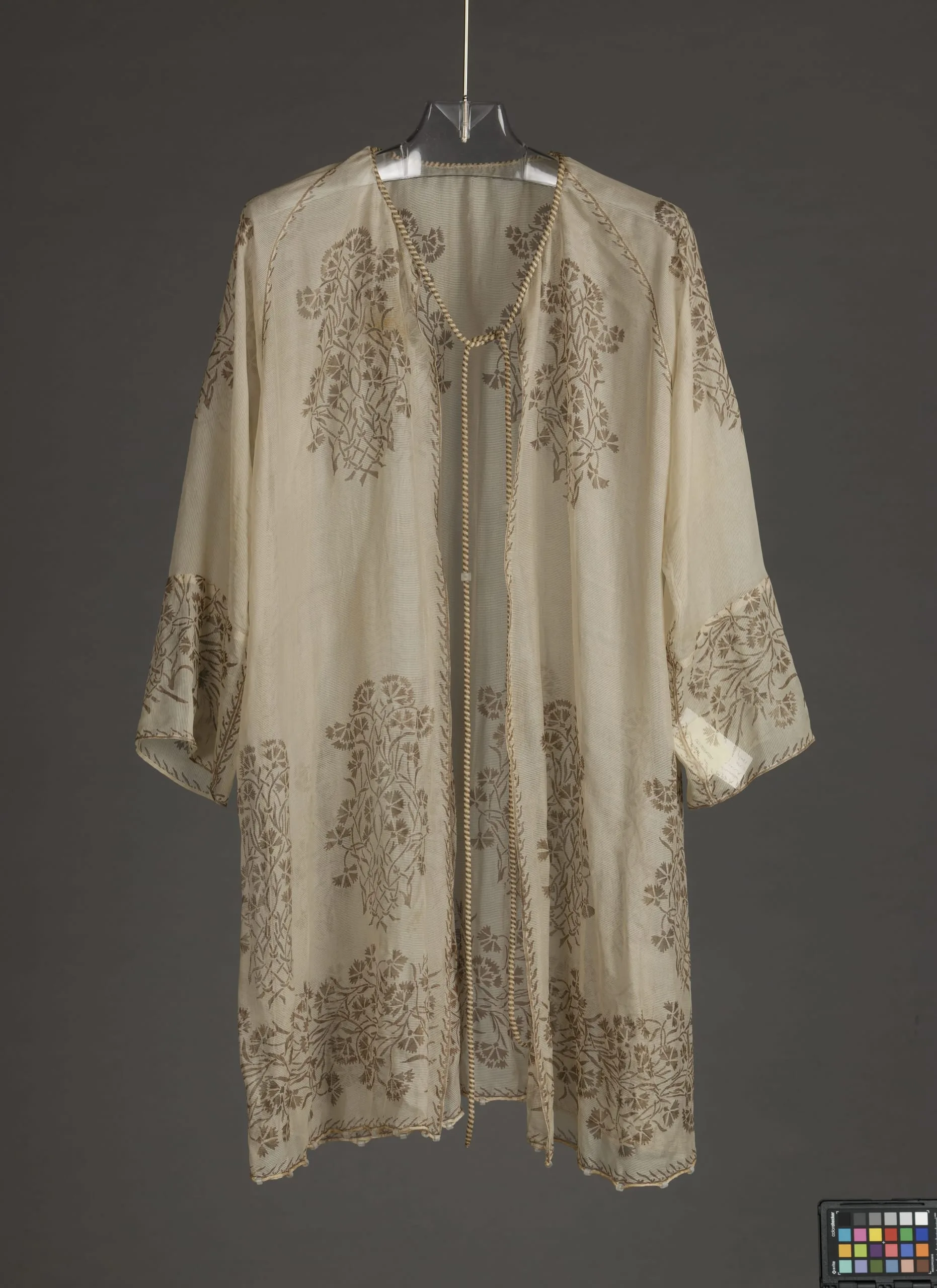 Cream silk or chiffon open-front robe with allover bronze-brown floral embroidery and twisted gold-and-ivory cord trim along the front edges and cuffs, displayed on a hanger