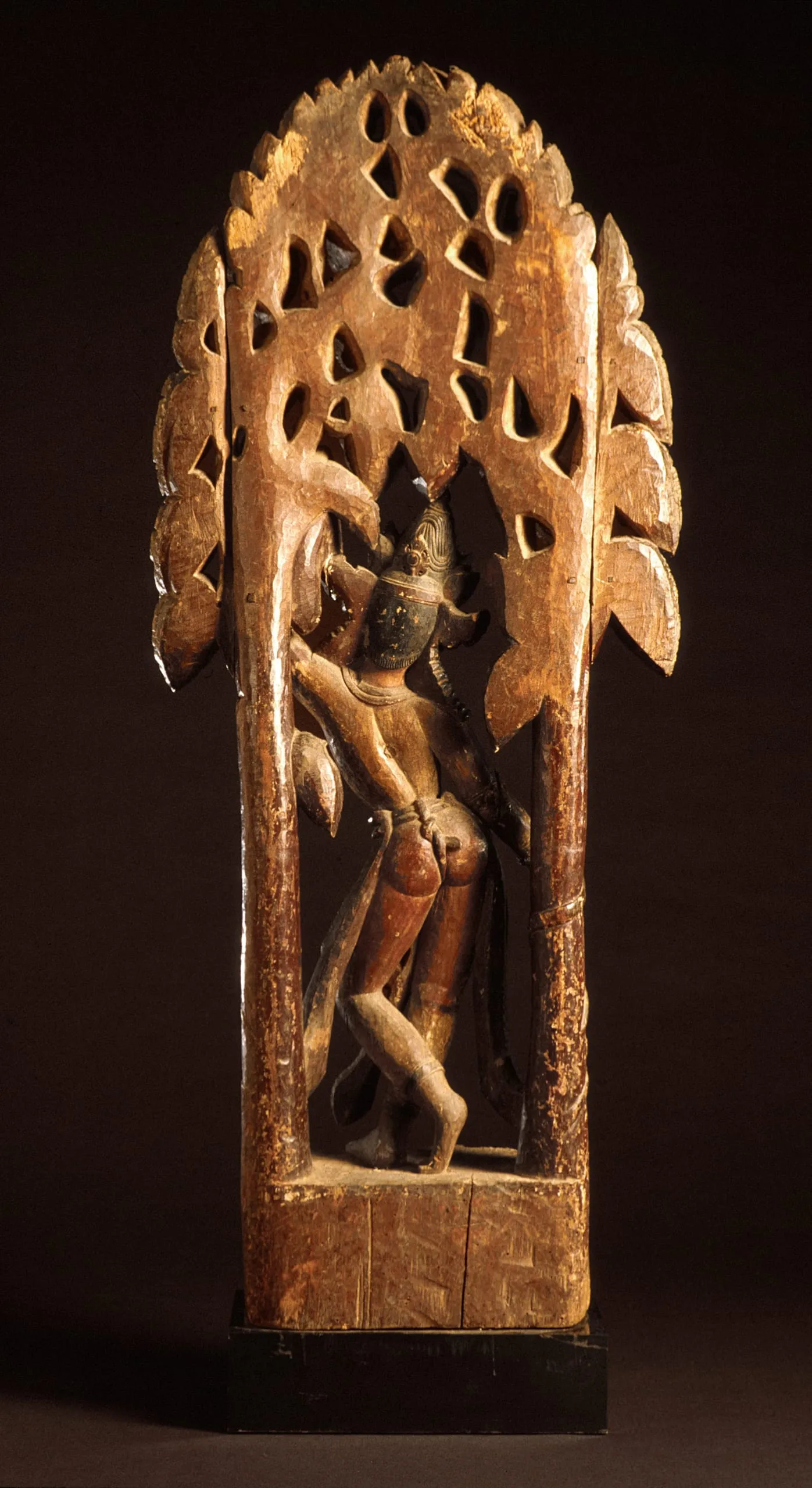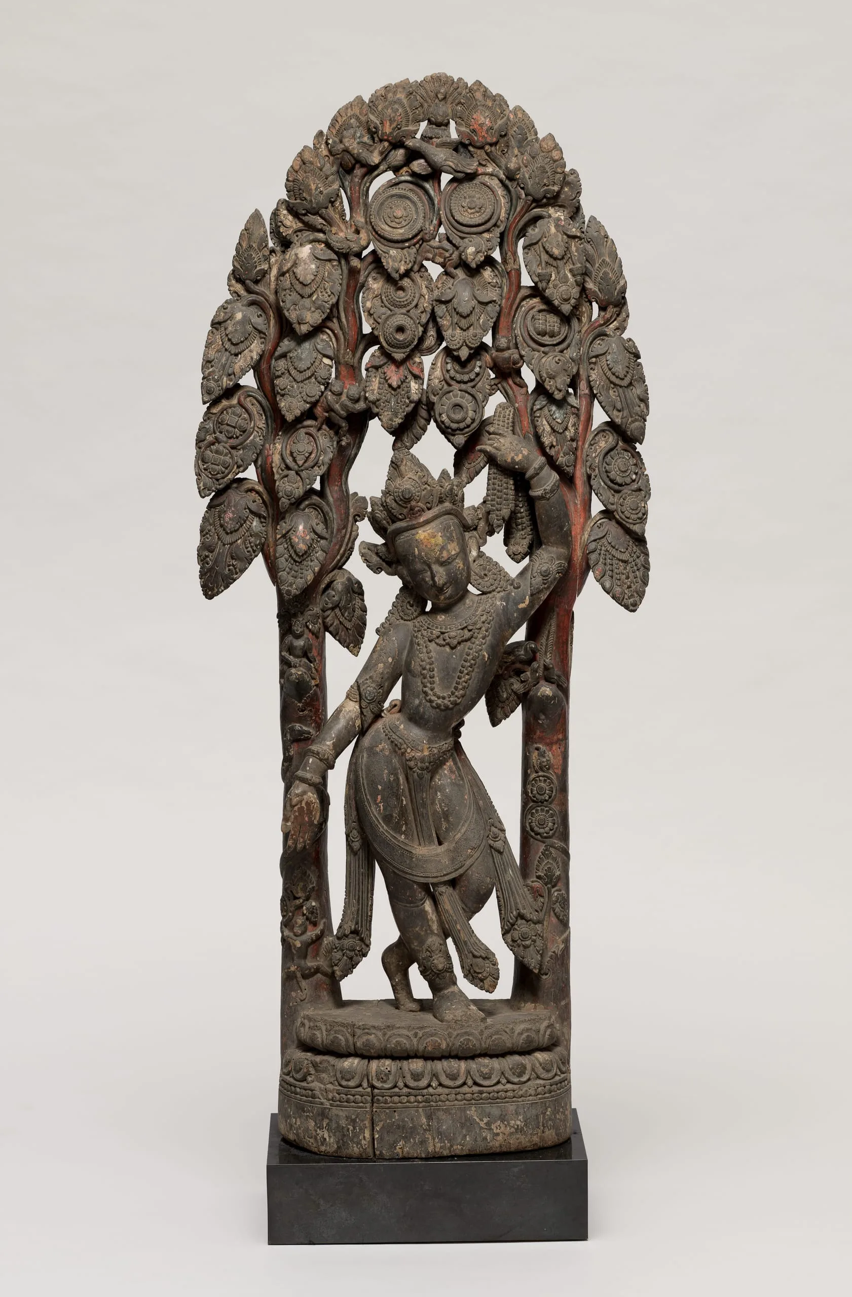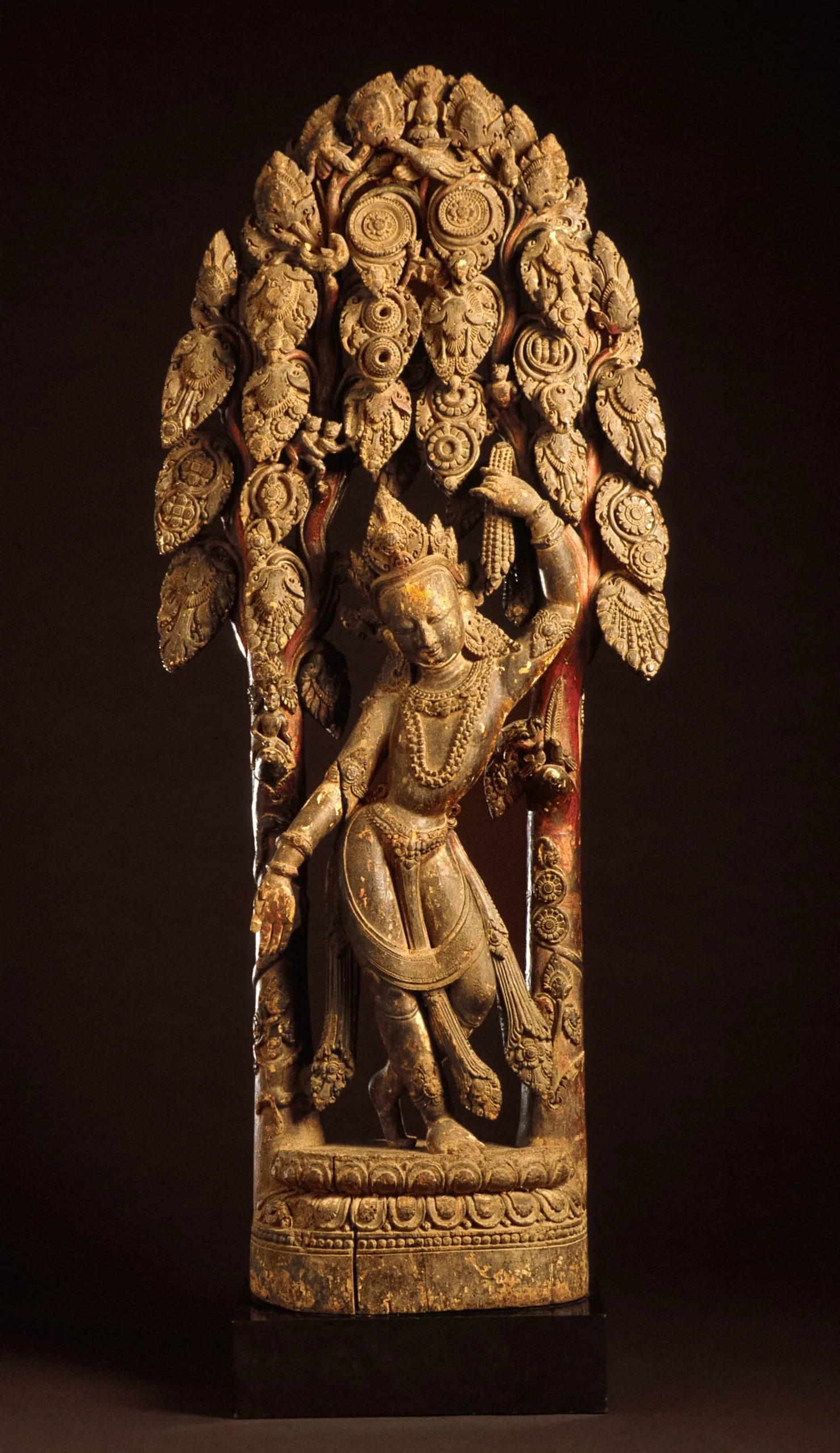 Chintamani Lokeshvara’s right hand is held in the gesture of ‘gift-giving’ (varada mudra) symbolic of his munificence. He stands gracefully with his legs crossed at the ankles and his left hand reaching up to grasp a garland of gems dangling from one of the two celestial wish-fulfilling trees (kalpa vriksha) that form a canopy over his head. Amidst the luxurious foliage and scrolling vine tendrils are birds and frolicking monkeys. Traces of devotional paint on the figure document its past ritual practice.