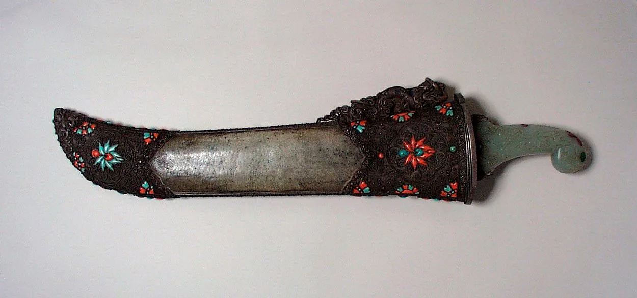 - Steel blade, nephrite jade handle; silver sheath with stingray skin and inlaid with coral, turquoise, and rubies