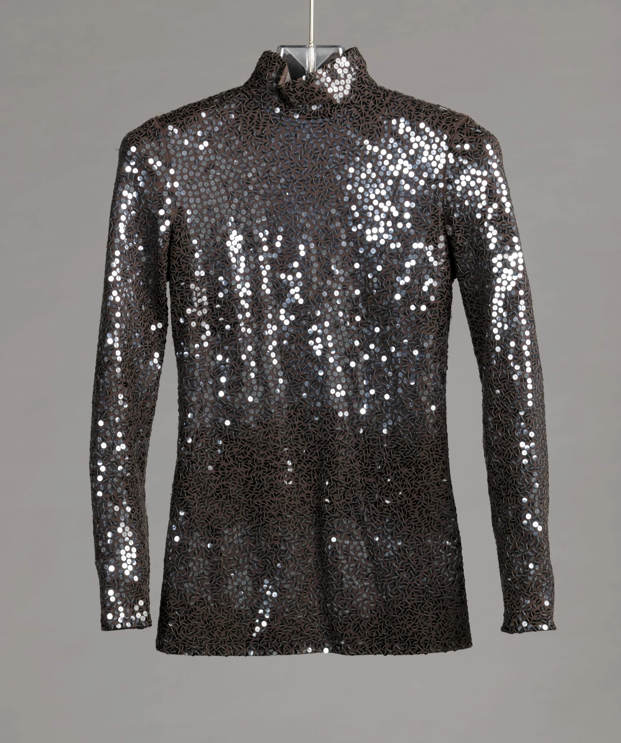 Fitted long-sleeved top with high collar, black embroidered ground covered in allover silver sequins, displayed on a hanger against a gray background