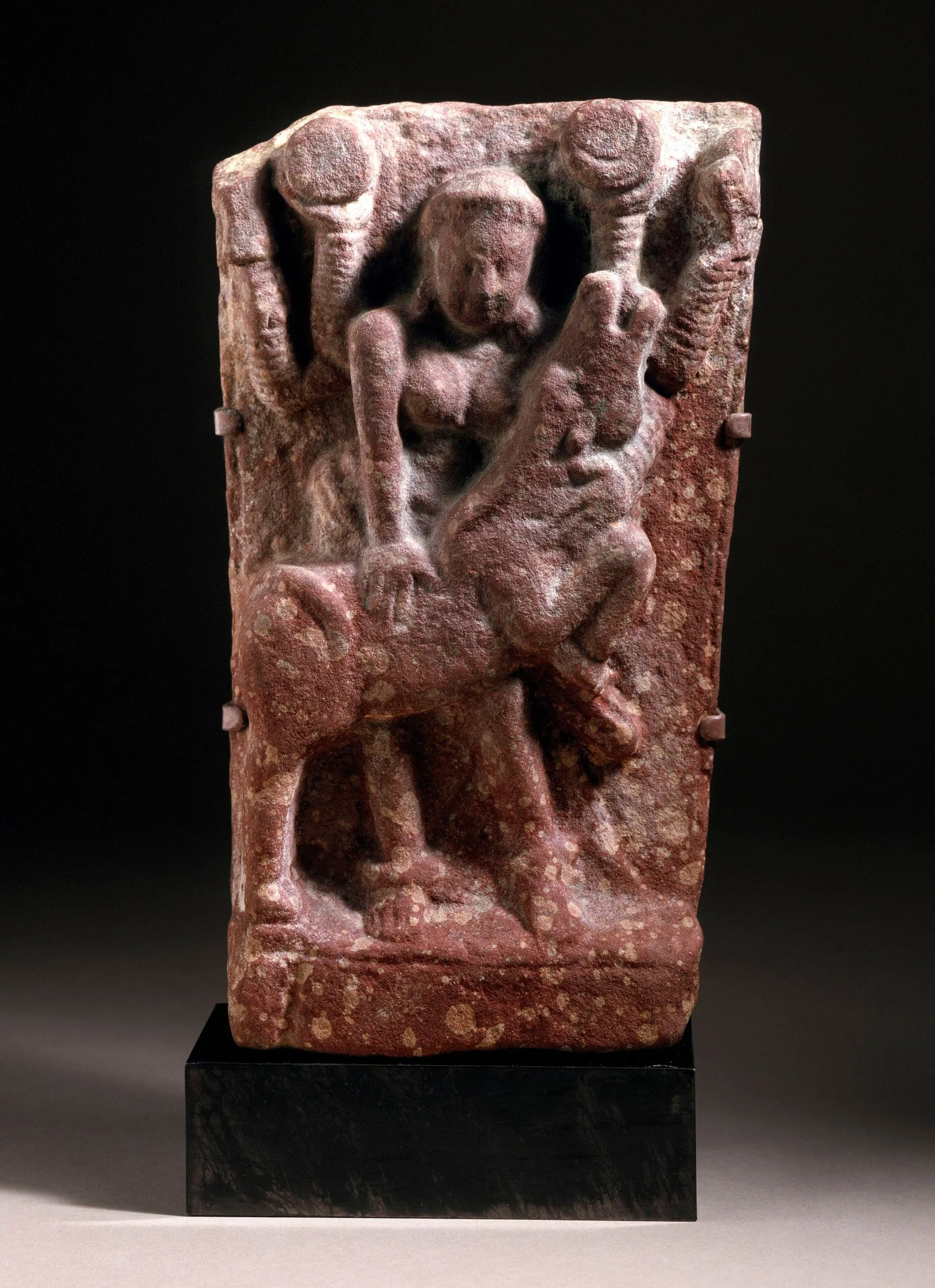 The Hindu goddess Durga (Unconquerable) first appears in Indian art during the Kushan Dynasty (circa 30-375) in small images such as this that were likely used in domestic shrines. One of the most widely venerated deities of Hinduism, Durga’s origins may be traced back to diverse tribal goddesses whose worship she absorbed, as well as to the ancient Middle East and Mediterranean region where various powerful warrior and mother goddesses were prominent. It was not until the Markandeya Purana (circa 250) with its later additions extoling Durga, which were subsequently extracted as a stand-alone text, the Devimahatmya (Glory of the Goddess; circa 550), that Durga became a foremost member of the Hindu pantheon. The Devimahatmya describes the great goddess in her various aspects triumphing over several demonic adversaries, including the buffalo demon Mahishasura (see M.77.19.27 and M.70.1.1).