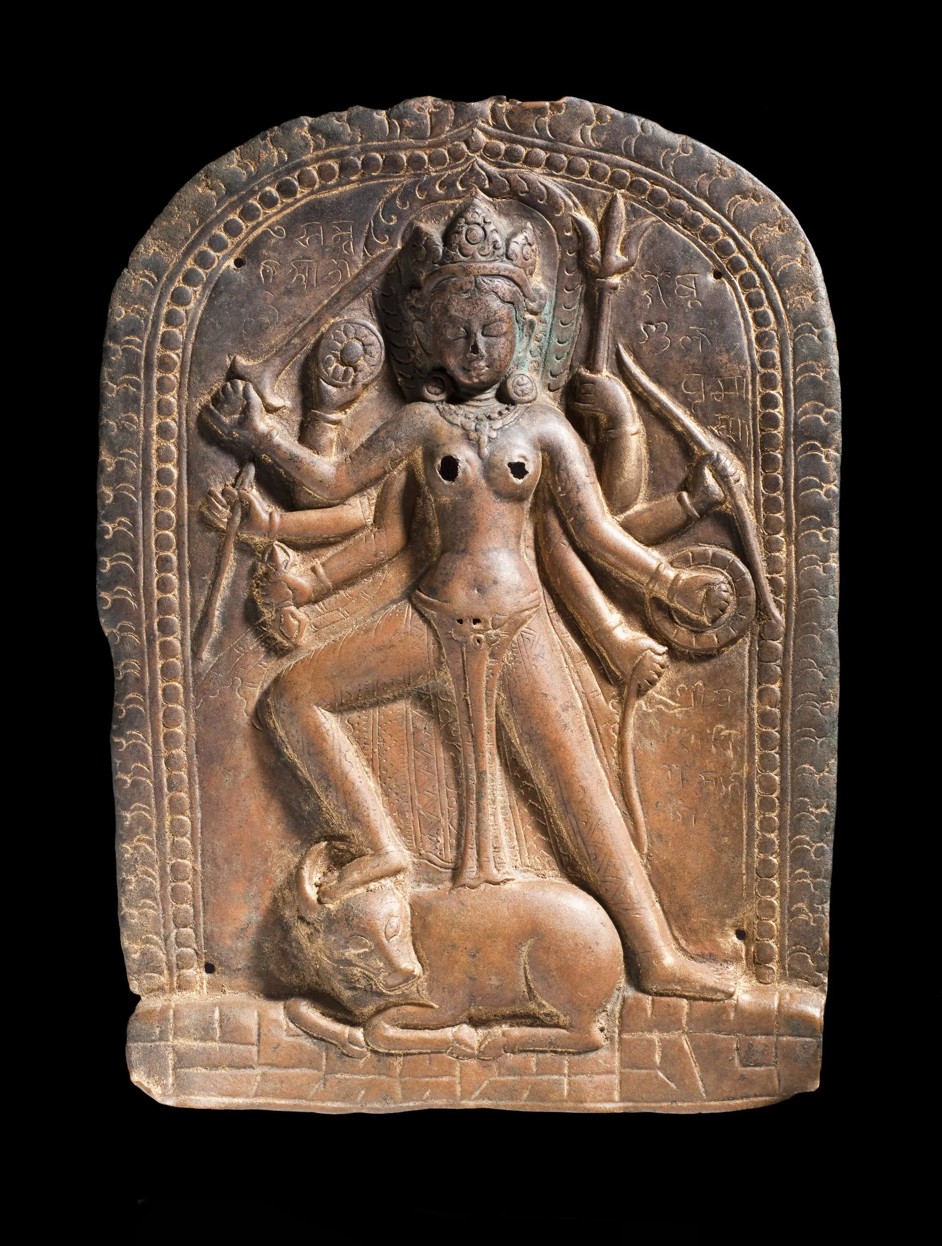 This inscribed repoussé copper alloy plaque was likely originally a metal sheath for a stone, wood, or earthenware image (kosha or kavaca). It depicts one of the most popular female deities in Hinduism, Durga (Unconquerable), in her aspect as the slayer of Mahisha, the buffalo demon. She is the powerful goddess of the battlefield who plays a vital role in the eternal struggle between good and evil. Durga was traditionally invoked by warriors before they went into battle. When the gods were unable to conquer the powerful Mahisha, who had received a boon from the god Brahma that he could only be killed by a woman, Durga was created from the energy of the gods’ combined anger to fight for them. Each god gave her a portion of his powers, and she carries their various weapons in her multiple arms, including the trident of Shiva, the discus of Vishnu, and the spear of Karttikeya. The myth of Durga's slaying of the buffalo demon may be interpreted primarily in sectarian terms, as proclaiming the powers of the goddess over those of the gods; anthropologically, however, it may also represent the assimilation into mainstream Hinduism of a totemistic buffalo cult.