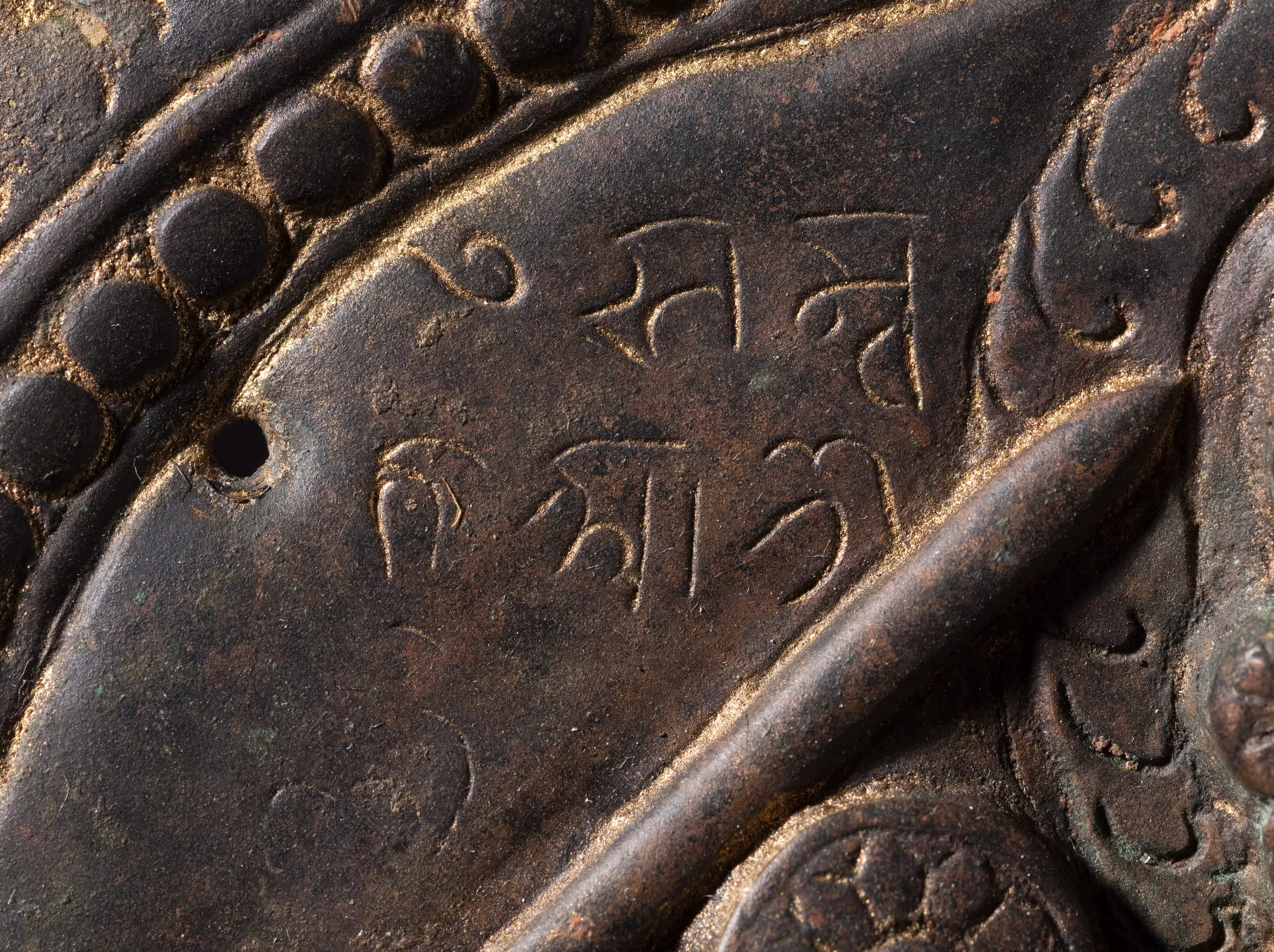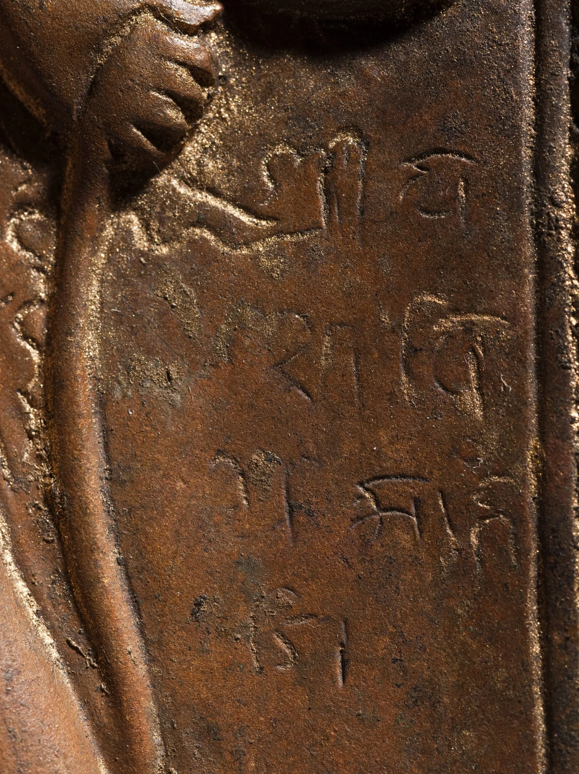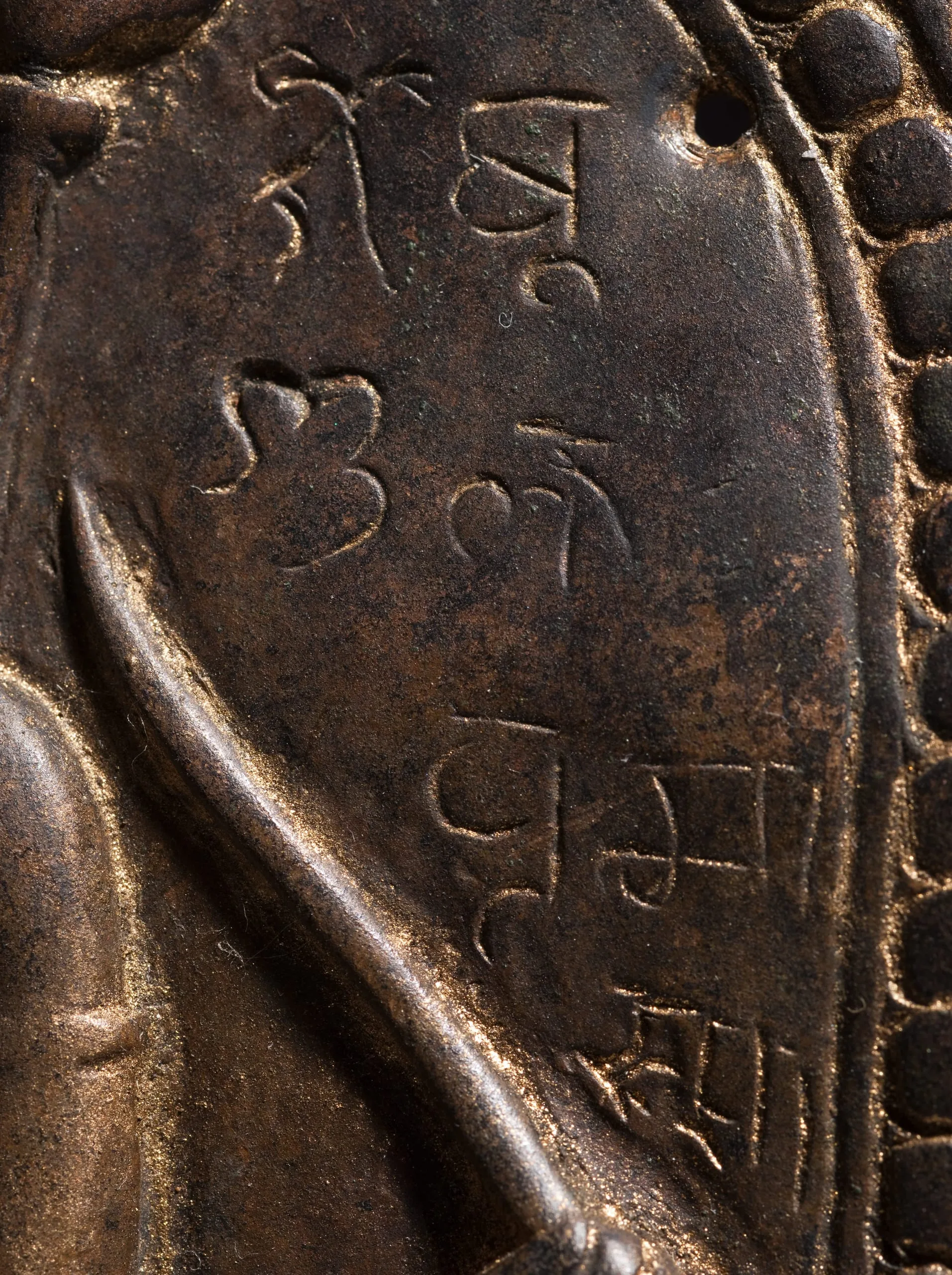 A devanagari inscription on the aureola’s plain inner area beside her head and left leg furnishes a date of (Nepal samvat) 310, corresponding to 1090 CE. The donor’s name is illegible. (See Ian Alsop, "Repousse in Nepal," Orientations 17: 7 (July 1986), pp. 17-18, Fig. 4.)