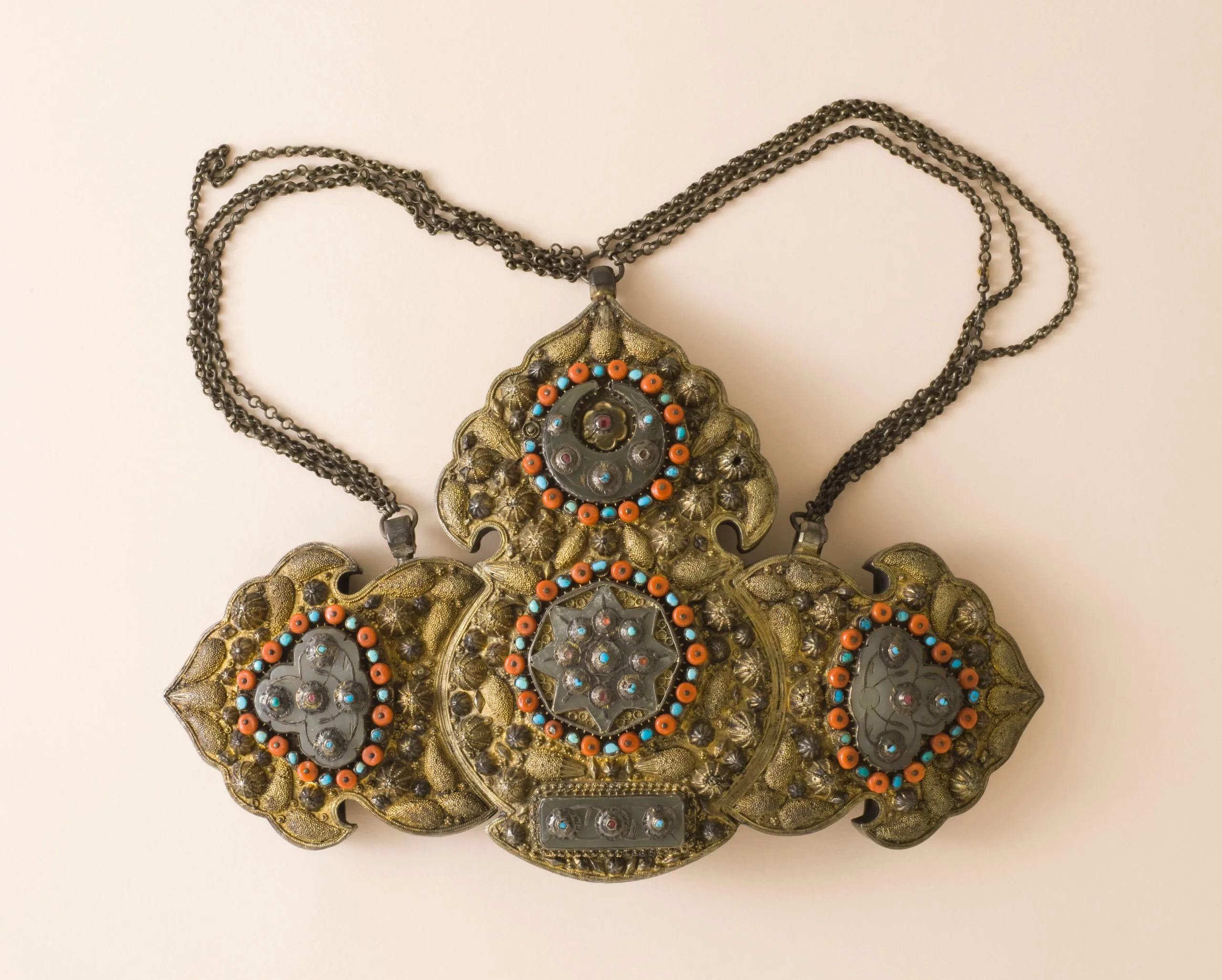 This large tri-lobed buckle is formed from gilt steel, accented with jade, turquoise, and coral, befitting a well-to-do Ottoman woman. Belts that could support buckles of this size served as visible markers of status and wealth, while offering an ideal place to casually display a finely embroidered handkerchief. Such large belt buckles provided the finishing touch to a woman’s indoor outfit, tying together the many layers of her ensemble, which included a transparent silk shift, a tight long-sleeved waistcoat, loose trousers, matching caftan, and a head covering. Similar buckle shapes appear in countless paintings of elite women produced by both European and Ottoman artists.