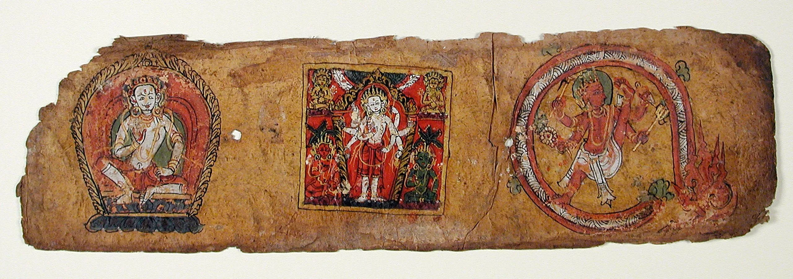 - Enthroned white figure in abhaya gesture (left), Enthroned white multi-armed figure (middle), Red figure with upraised leg in circle/serpent (right), Folio from a Pancharaksha (The Five Protective Charms)