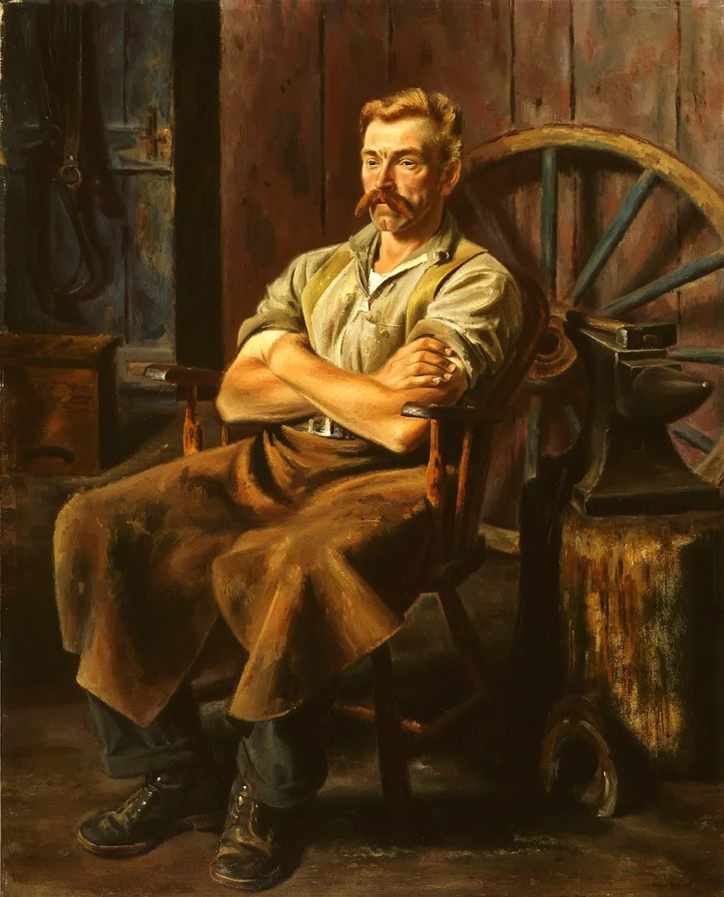 Speicher usually depicted the brawny Moore wearing work clothes-a rough shirt, pants, and heavy shoes-characteristic of the rural American laborer. (Speicher thought of him as an independent son of the soil.) He placed Moore in interior settings natural for him, often with different implements indicative of his manly activities: an anvil and wheel for this blacksmith scene, a gun for the painting of Moore as a hunter, and a table laden with food for the image of Moore as a farmer. A restrained palette was typical of Speicher, and here the choice of browns was exceptionally well suited for underscoring the rugged, masculine quality of the image. Further conveying Moore’s physical power is his assertive gesture of crossing his muscular arms over his broad chest.