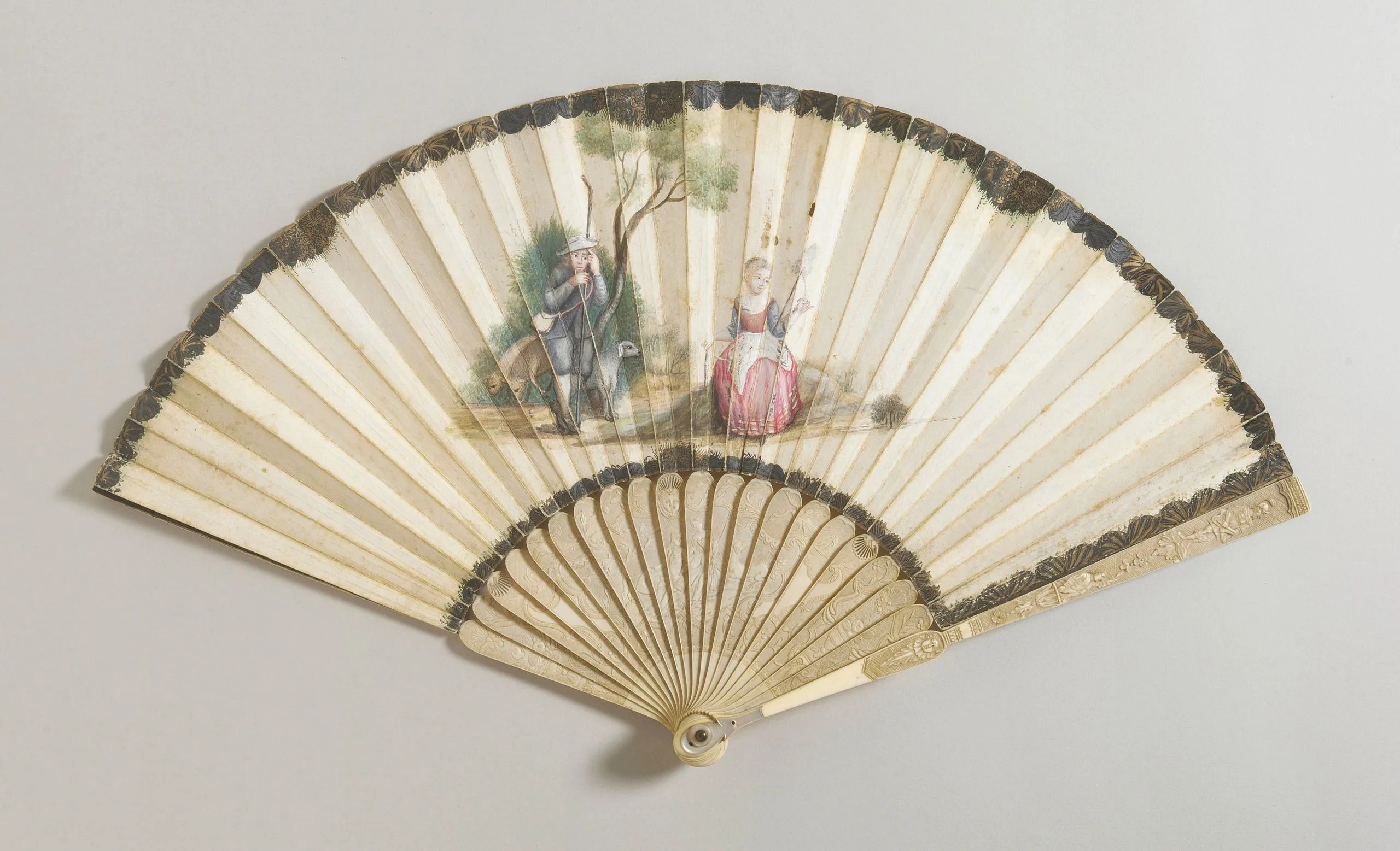 - Vellum leaf with gouache and gold paint, ivory sticks and guard
