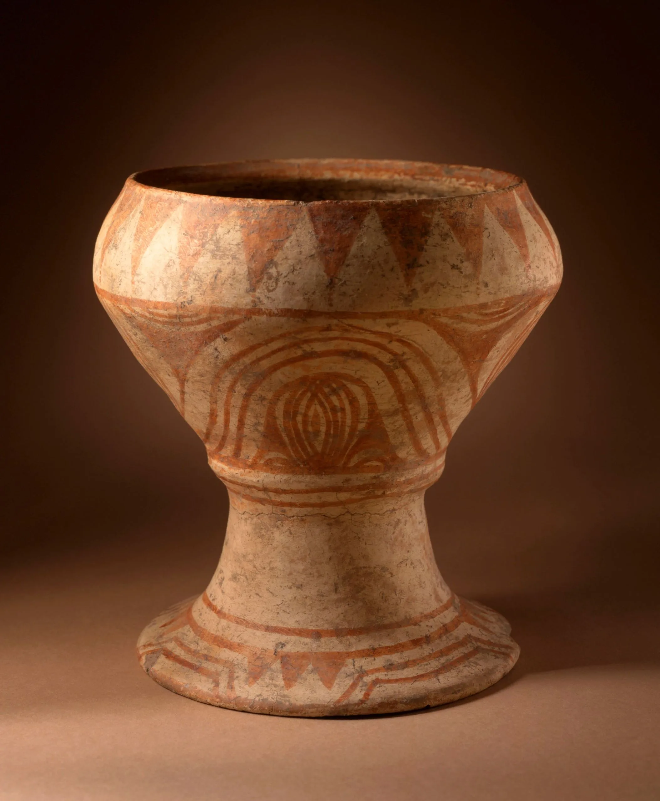 - Coil-built earthenware with cream slip and painted decoration