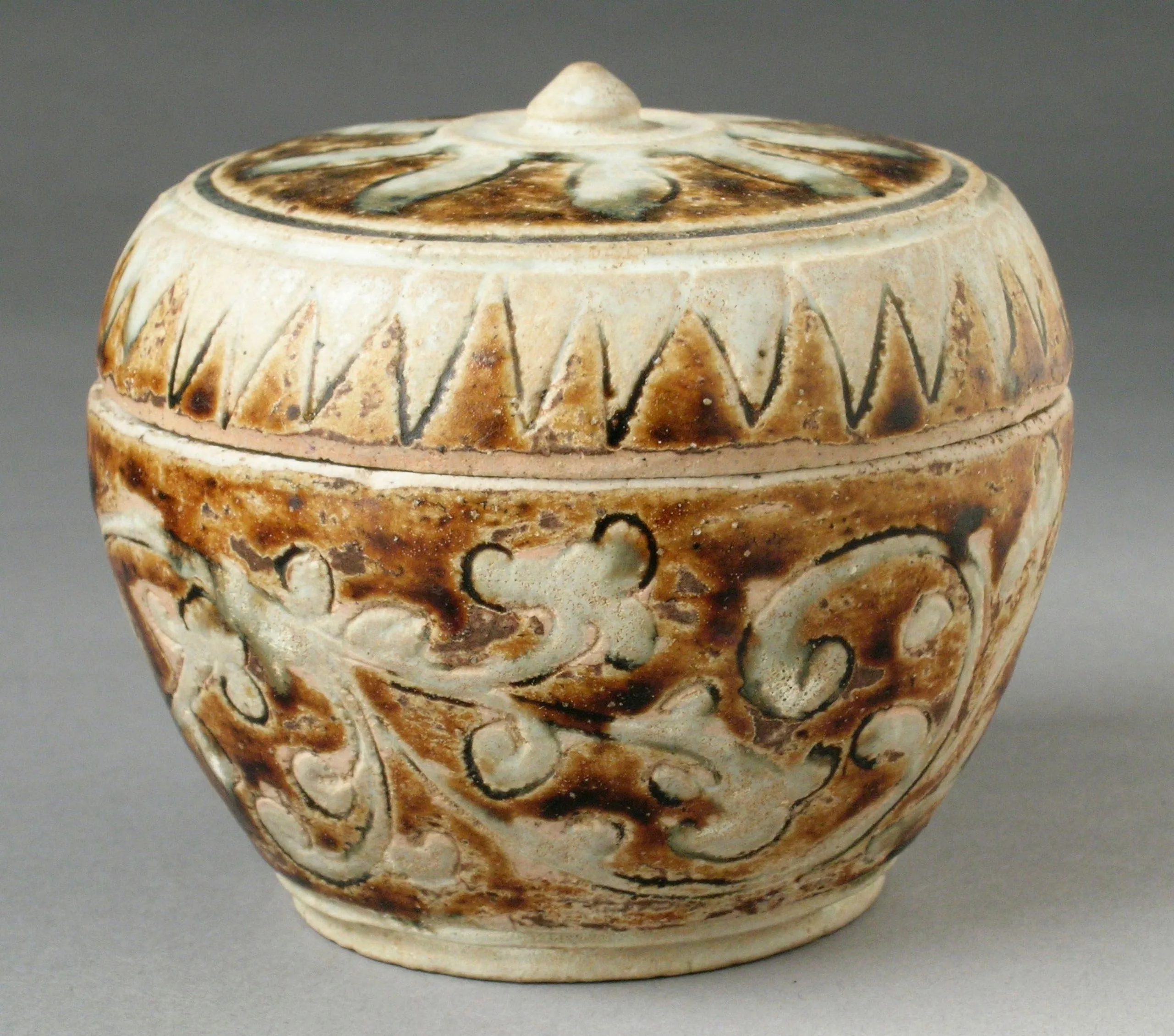 - Stoneware with incised decoration and brown and white glaze