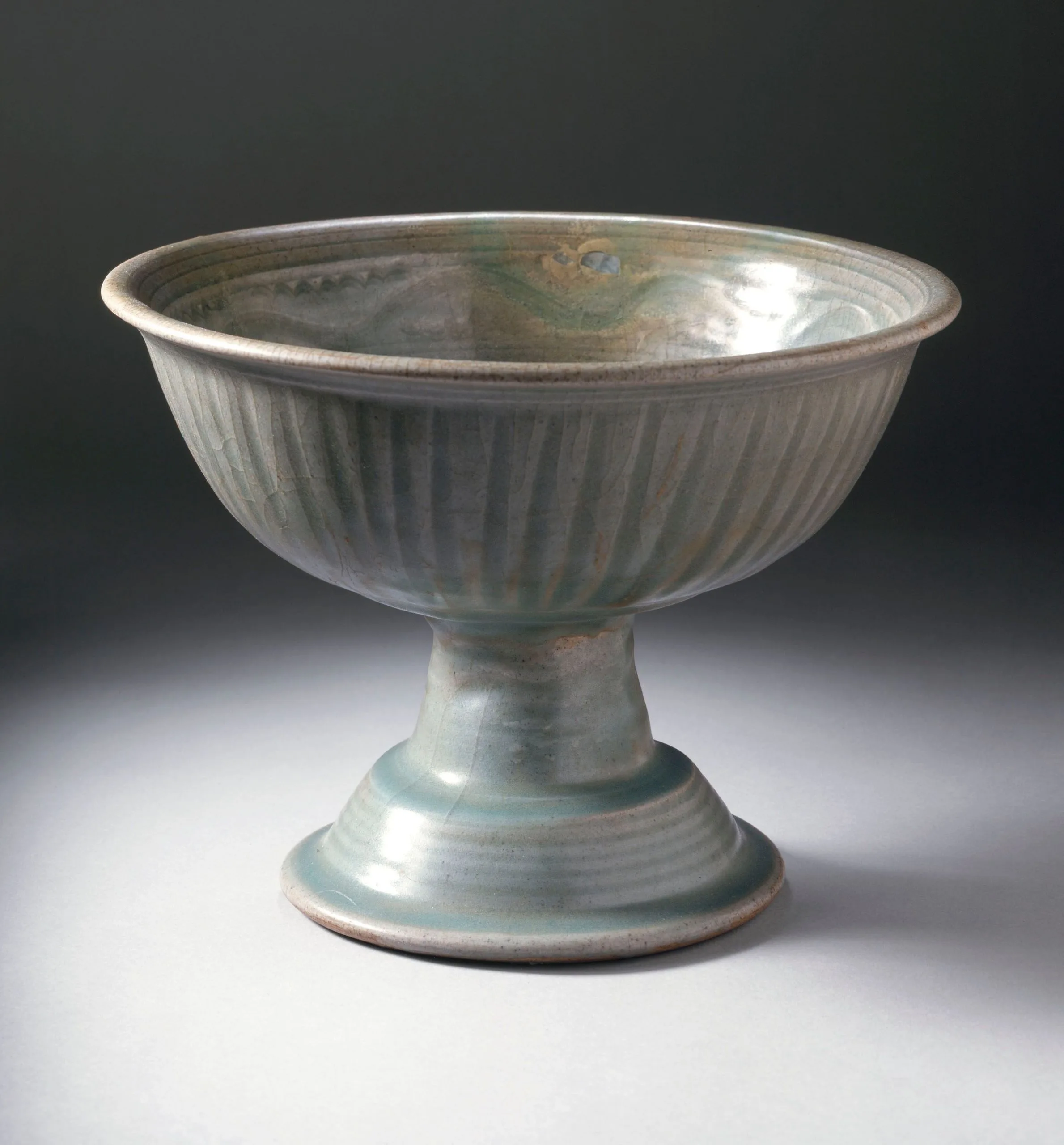 - Wheel-thrown stoneware with incised decoration and celadon glaze