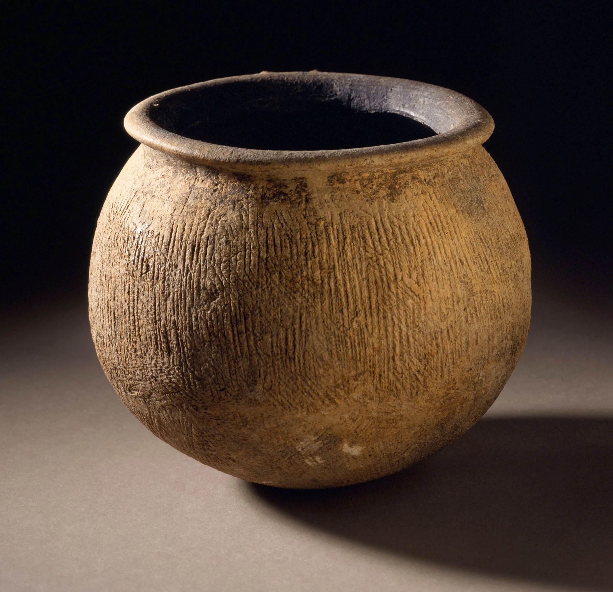 Ceramic vessel with a nearly spherical body, sandy tan exterior covered in closely spaced vertical incised lines, small rounded base, and dark rim