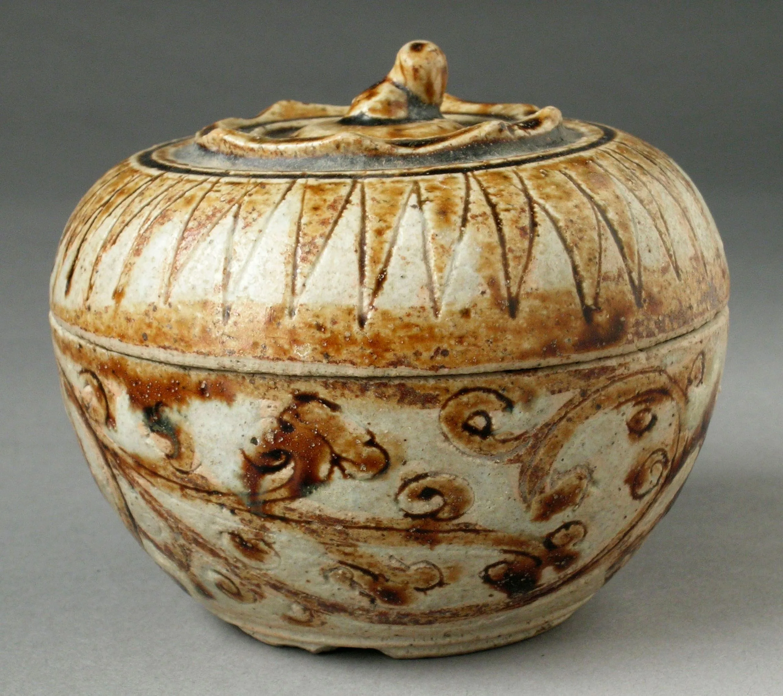 - Stoneware with incised decoration and brown and white glaze