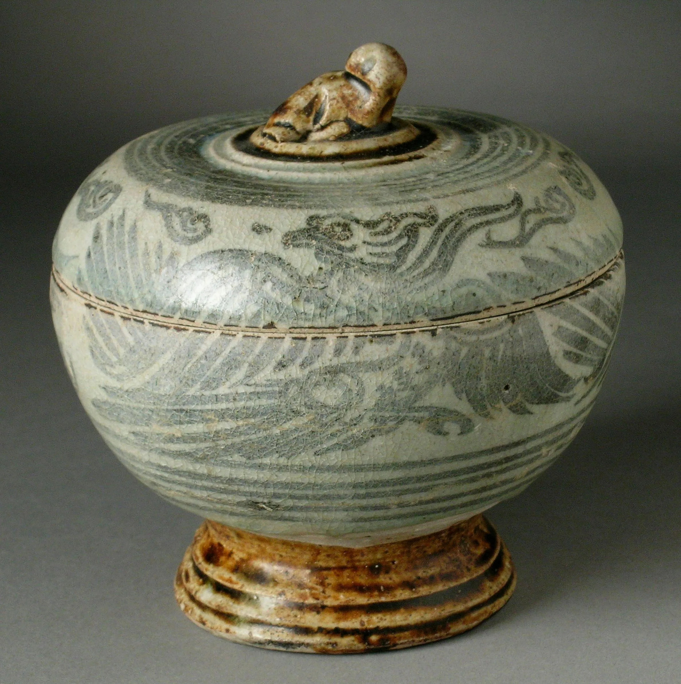 - Wheel-thrown stoneware with cream slip, underglaze brown painted decoration, and pale blue glaze