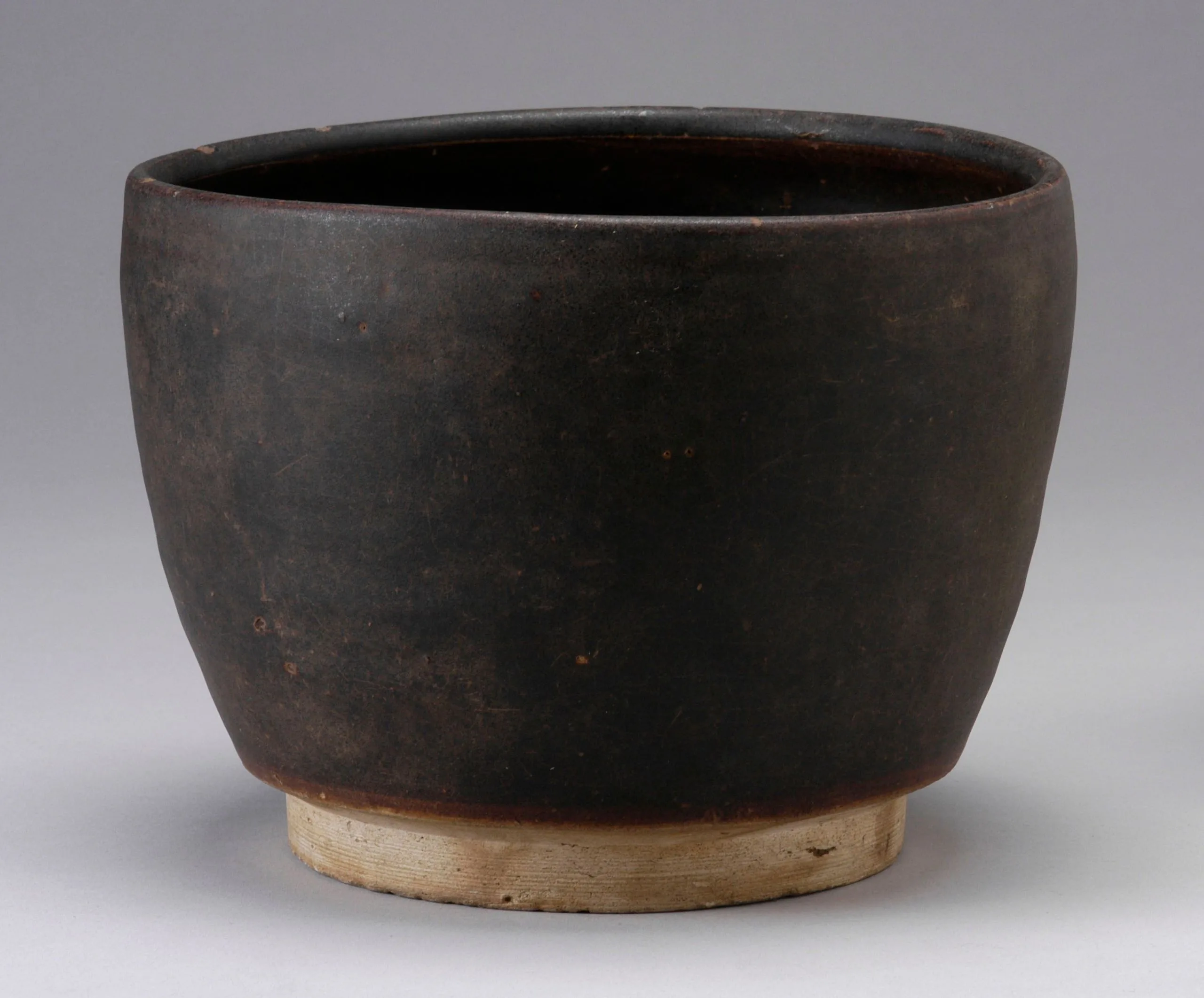 Ceramic vessel with wide rounded body, matte charcoal-black surface, and unglazed buff-colored foot ring