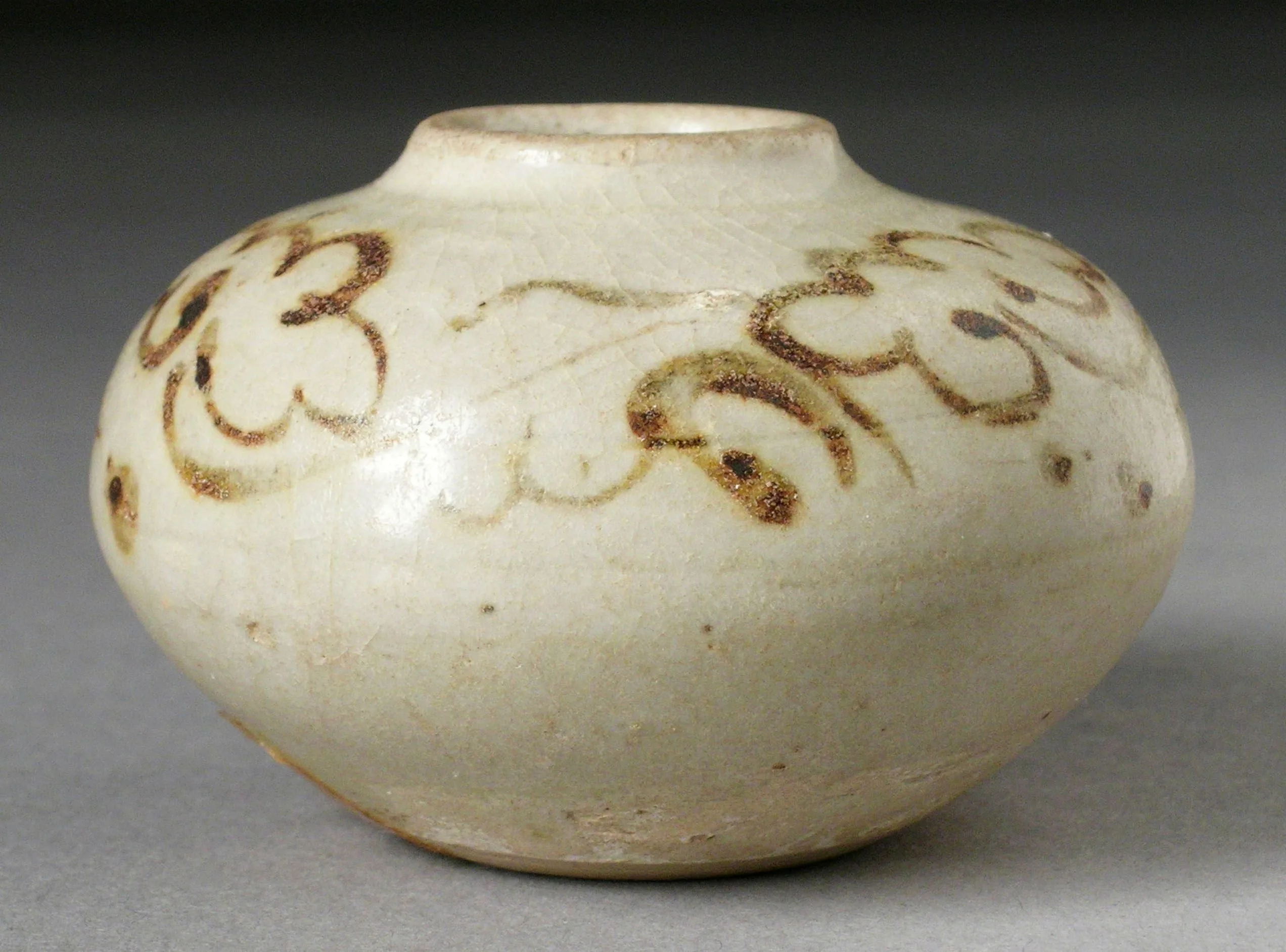 - Wheel-thrown stoneware with cream slip, underglaze brown painted decoration, and clear glaze