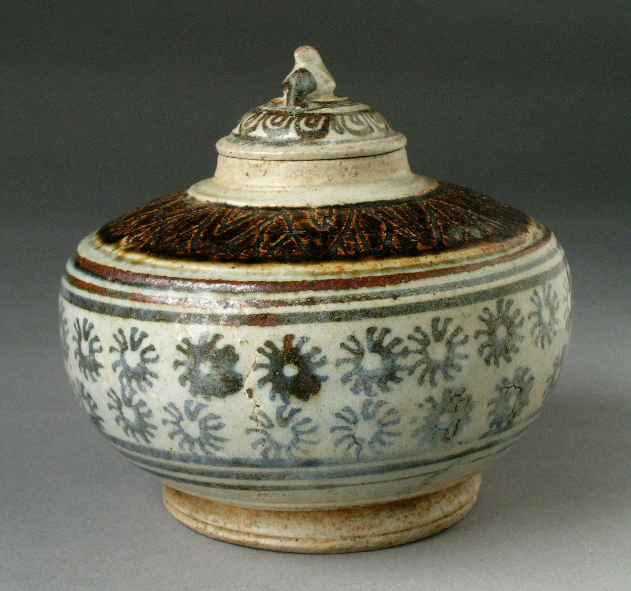 - Stoneware with underglaze brown painted decoration and partial brown glaze
